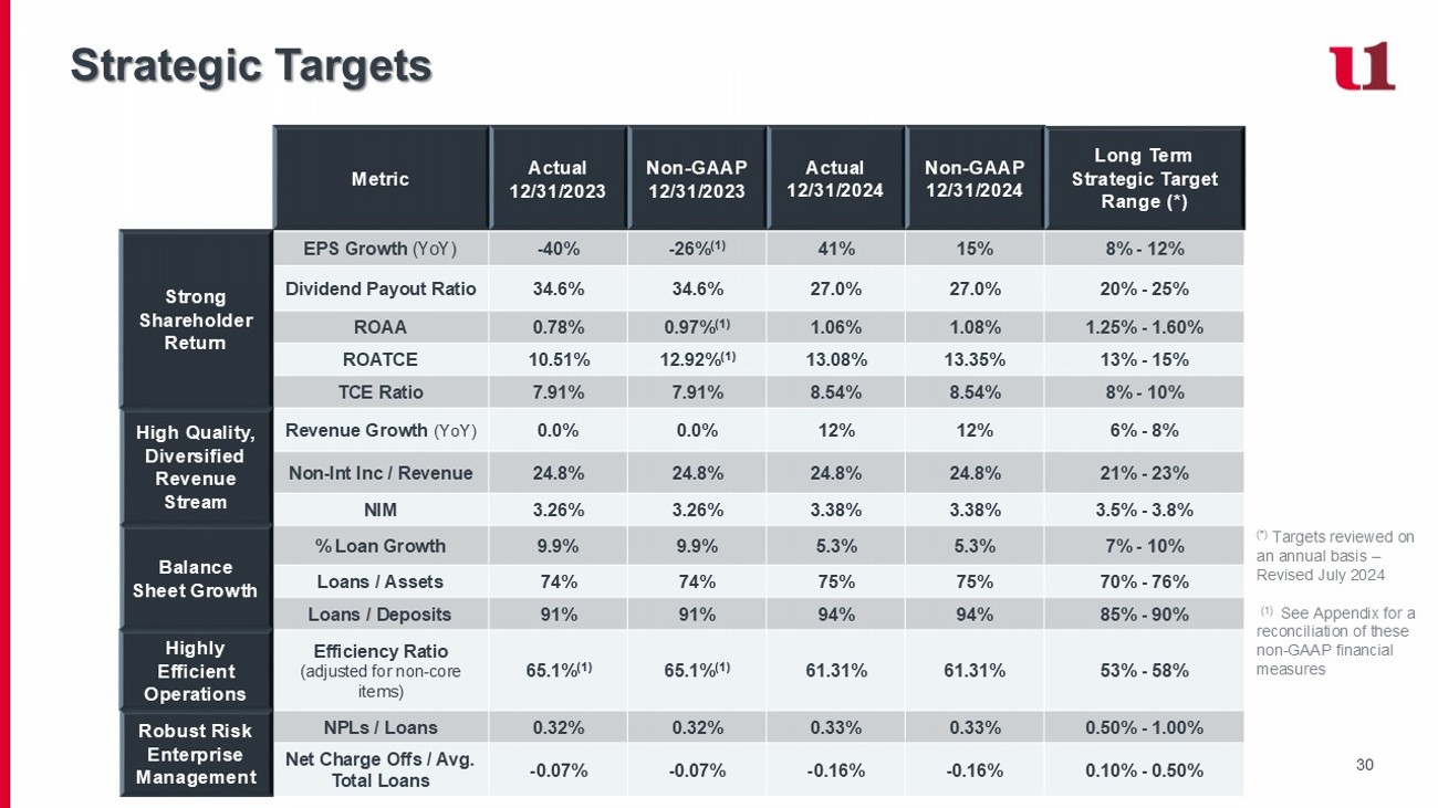 30个战略目标长期战略目标区间(*)Non-GAAP 12/31/2024实际12/31/2024 Non-GAAP 12/31/2023实际12/31/2023指标8%-12% 15% 41%-26%(1)-40% EPS增长(同比)强劲股东回报20%-25% 27.0% 27.0% 34.6% 34.6%派息率1.25%-1.60% 1.08% 1.06% 0.97%(1)0.78% ROAA 13%-15% 13.35% 13.08% 12.92%(1)10.51% ROATCE 8%-10% 8.54% 8.54% 7.91% 7.91% TCE比率6%-8% 12% 12% 12% 0.0% 0.0%收入增长(同比)高质量,多元化收入流21%-23% 24.8% 24.8% 24.8% 24.8% Non-Int Inc/revenue 3.5%-3.8% 3.38% 3.38% 3.26% 3.26% N IM 7%-10% 5.3% 5.3% 9.9% 9.9%贷款增长资产负债表增长70%-76% 75% 75% 74%贷款/资产85%-90% 94% 94% 91% 91%贷款/存款53%-58% 61.31% 61.31% 65.1%(1)65.1%(1)效率比(调整后非核心项目)高效运营0.50%-1.00% 0.33% 0.33% 0.32% 0.32%不良贷款/贷款稳健风险企业管理0.10%-0.50%-0.16%-0.16%-0.07%-0.07%净冲销/平均贷款总额(*)每年审查的目标– 2024年7月修订(1)这些非公认会计原则财务指标的调节见附录
