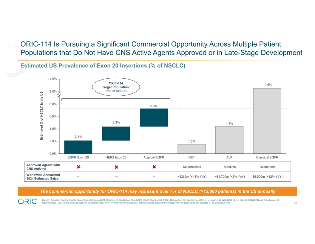 ORIC-114计划的下一步行动和潜在注册路径202520262027 + • EGFR外显子20抑制剂初创期1b • EGFR非典型突变队列• HER2外显子20 EGFR外显子20,2027年对先前外显子20多个潜在潜在2期NDA备案未做EGFR非典型突变2L批准的注册试验HER2外显子20 • EGFR外显子20单药治疗1b期• EGFR外显子20组合与SC amivantamab队列• EGFR非典型单药治疗多个潜在EGFR外显子20(单药或组合)2028年NDA备案1L批准的潜在3期试验EGFR非典型单药治疗更新的1b期数据预计将于2025年上半年发布,预计将于2025年下半年启动多个加速注册队列;潜在用于ORIC-114 1L注册试验(s)于2026年启动22 1L NSCLC 2L NSCLC策略策略