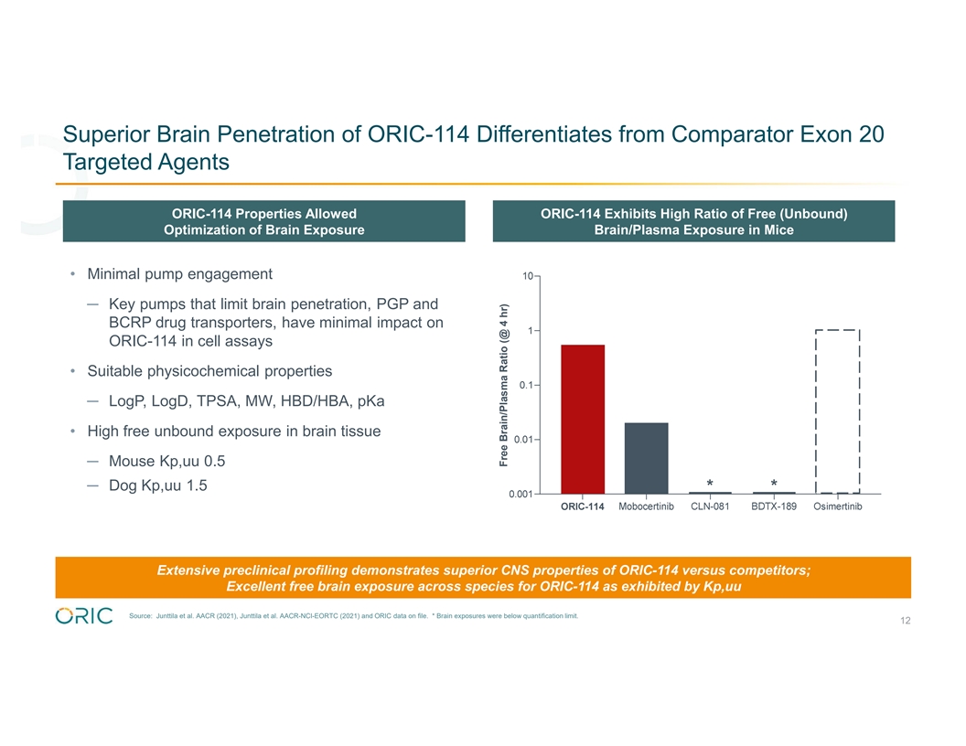 ORIC-114的卓越脑穿透力区别于比较者外显子20靶向剂ORIC-114特性允许ORIC-114在小鼠脑暴露脑/血浆暴露中表现出高比例的自由(未绑定)优化•最小的泵接合─限制脑渗透的关键泵、PGP和BCRP药物转运蛋白,在细胞测定中对ORIC-114的影响最小•合适的物理化学特性─ logP、logD、TPSA、MW、HBD/HBA,pKA •脑组织高游离未结合暴露─小鼠KP、uu0.5 ─狗KP、uu1.5**广泛的临床前分析表明ORIC-114与竞争对手相比具有优越的CNS特性;如KP、uu所展示的ORIC-114跨物种的出色自由脑暴露资料来源:Junttila等人AACR(2021)、Junttila等人AACR-NCI-EORTC(2021)和存档的ORIC数据。*大脑暴露低于定量限值。12游离脑/血浆比(@4小时)