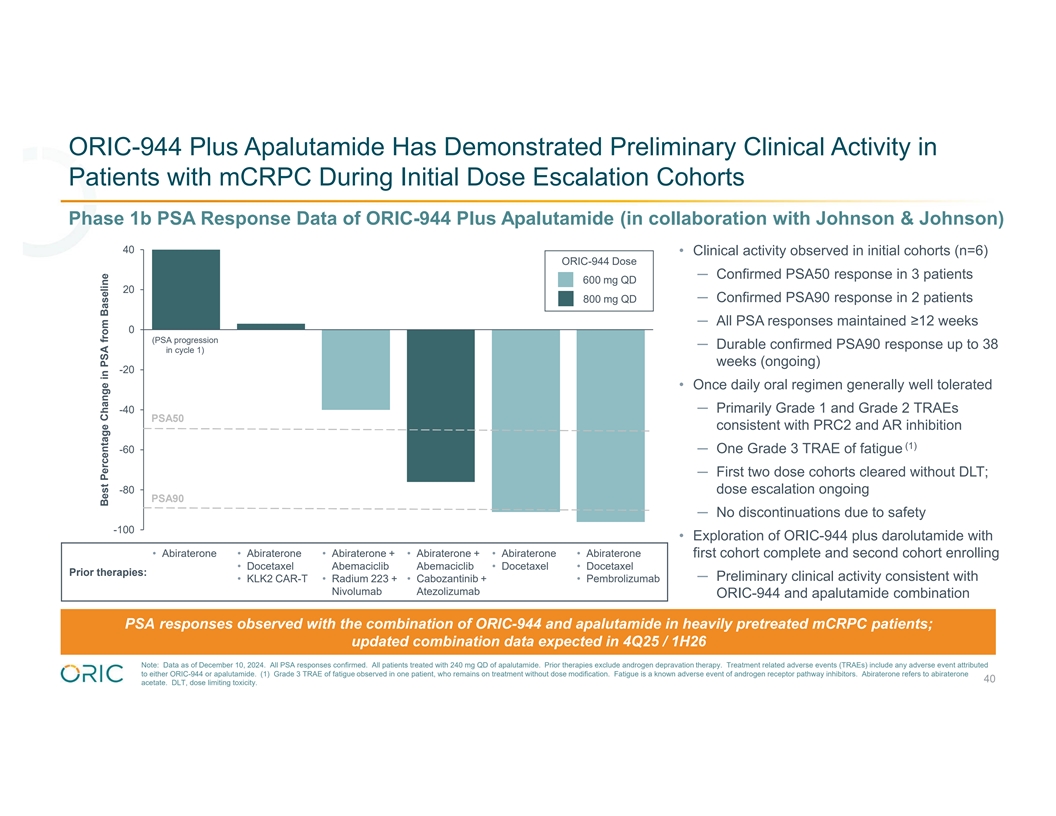ORIC-944加阿帕鲁胺在初始剂量递增队列mCRPC患者中显示出初步临床活性ORIC-944加阿帕鲁胺的1b期PSA应答数据(与强生合作)40 •在初始队列(n = 6)中观察到的临床活性ORIC-944剂量─ 3例患者证实PSA50应答600mg QD 20800mg QD ─ 2例患者证实PSA90应答─所有PSA应答维持≥ 12周0(PSA进展─持久证实PSA90应答高达1周期38)周(进行中)-20 •每日一次口服方案一般耐受性良好-40 ─首要级符合PRC2和AR抑制的1级和2级TRAE PSA50(1)-60 ─疲劳的1级3级TRAE ─前两个剂量组在没有DLT的情况下清除;-80剂量递增正在进行的PSA90 ─由于安全性没有停用-100 •探索ORIC-944加地鲁鲁胺与•阿比特龙•阿比特龙•阿比特龙+ •阿比特龙•阿比特龙第一组完成和第二个队列入组•多西他赛Abemaciclib abemaciclib •多西他赛•多西他赛先前疗法:─初步临床活性与• KLK2 CAR-T •镭223 + •卡博替尼+ •帕博利珠单抗阿替珠单抗ORIC-944和阿帕鲁胺联合用药在大量预处理的mCRPC患者中观察到的阿帕鲁胺联合PSA反应一致;预计在4Q25/1H26更新的联合数据注:截至2024年12月10日的数据。PSA的所有回应都得到了证实。所有患者均接受240mg阿帕鲁胺QD治疗。先前的疗法不包括雄激素减退疗法。治疗相关不良事件(TRAE)包括由ORIC-944或阿帕鲁胺引起的任何不良事件。(1)在1名患者中观察到的3级疲劳TRAE,该患者仍在接受治疗,没有进行剂量调整。疲劳是已知的雄激素受体通路抑制剂的不良事件。阿比特龙是指醋酸阿比特龙40。DLT,剂量限制性毒性。PSA较基线的最佳百分比变化
