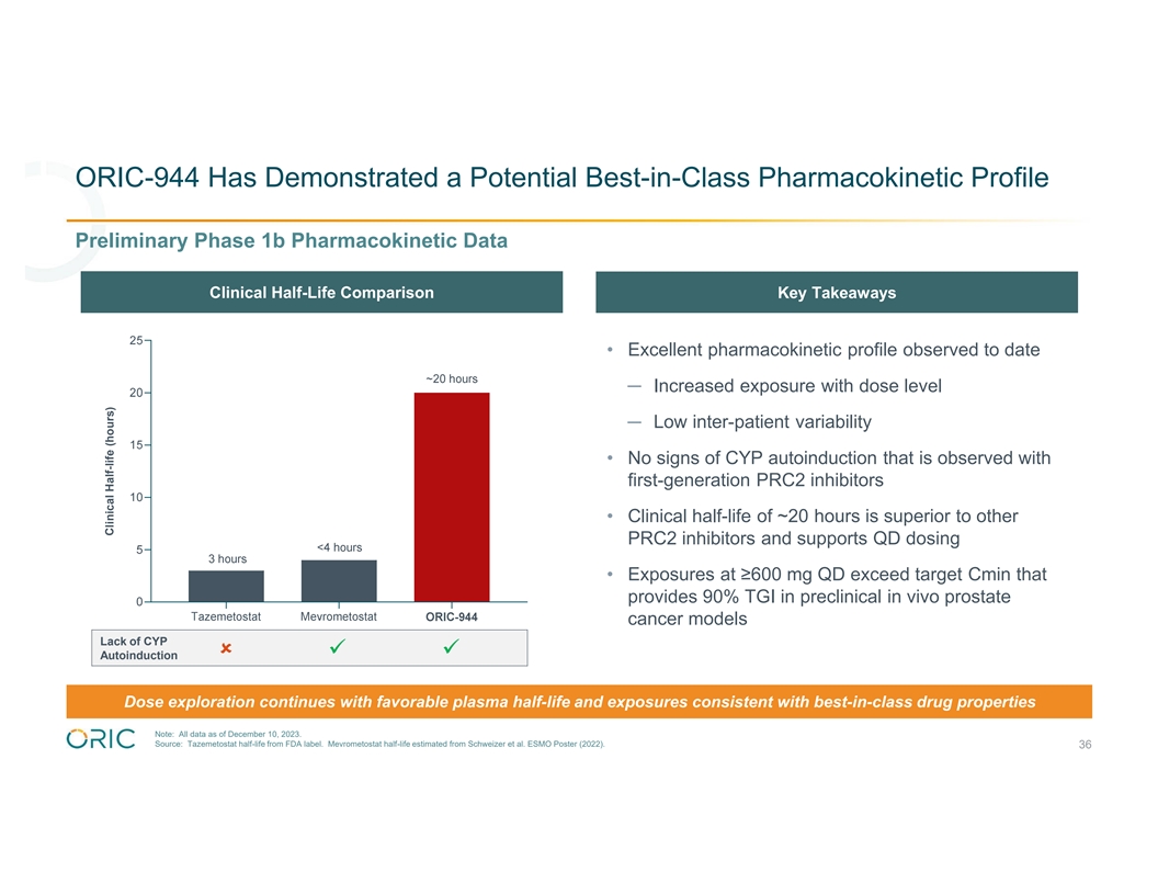 ORIC-944在转移性前列腺癌1b期的首次人体1b期研究,多中心,开放标签研究单药剂量递增单药目标q强药物特性关键资格q长半衰期•转移性前列腺ORIC-944癌症q剂量比例暴露•单药剂•进展:• i3 + 3设计─ ≥ 1个AR抑制剂(s)q无CYP自体诱导•口服每日一次给药─ ≤ 2个化疗方案q稳健靶点接合• ECOG 0-1 q耐受性良好的1b期,旨在确认ORIC-944差异化单药特征,并将ORIC-944定位为潜在的同类最佳PRC2抑制剂,用于前列腺癌联合开发35筛查/入组