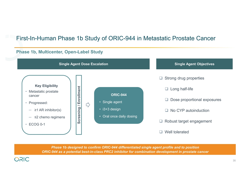 ORIC-944在前列腺癌异种移植肿瘤中联合AR抑制剂提高无进展生存期前列腺癌体内无进展生存期模型100载体达罗鲁胺美伏司他+达罗鲁胺ORIC-944 50 +达罗鲁胺0010203040天治疗后美伏司他+ ORIC-944 +载体达罗鲁胺达罗鲁胺中位生存期(天)1112.5 24.5未达到ORIC-944联合达罗鲁胺提高治疗难治环境中的无进展生存期体内注:C4-2模型在去势小鼠中生长。达鲁鲁胺50mg/kg BID、美伏司他100mg/kg BID、ORIC-944 100mg/kg QD。无药物相关耐受性问题。肿瘤体积> 800mm3或发病的进展事件。34无进展生存期(%)