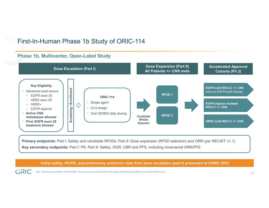 ORIC-114 1b期首次人体1b期研究,多中心,开放标签研究剂量扩展(第二部分)加速批准剂量递增(第一部分)所有患者+/-CNS mETS队列(PH2)关键资格EGFR ex20 NSCLC +/-CNS •未接受EGFR ex20疗法的晚期实体瘤RPTD 1 ─ EGFR外显子20 ORIC-114 ─ HER2外显子20 •单药EGFR非典型突变─ HER2 + NSCLC +/-CNS • i3 + 3设计─ EGFR非典型•活性CNS •口服QD/BID每日给药RPTD 2候选转移允许RPTD HER2 ex20 NSCLC +/-CNS •先前的EGFR外显子20选定治疗允许原发性和候选RPTD;第二部分:剂量扩展(RPTD选择)和ORR(根据RECIST V1.1)关键次要终点:第一部分:PK;第二部分:安全性;DOR、CBR和PFS,包括颅内ORR/PFS的初始安全性、PK/PD,以及在ESMO 2023上展示的来自剂量递增的初步抗肿瘤数据(第一部分)注:ClinicalTrials.gov标识符:NCT05315700。剂量扩展可能包括QD和BID给药、fed/fasted给药。RPTD,推荐2期剂量13筛查/入组