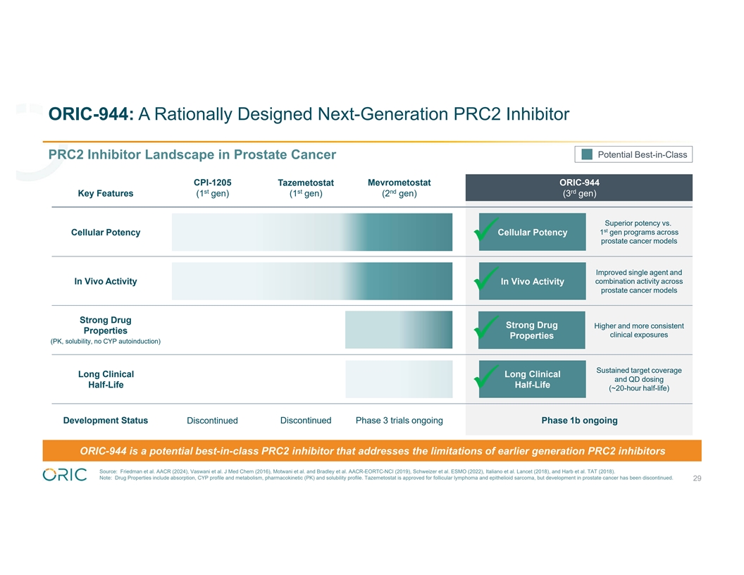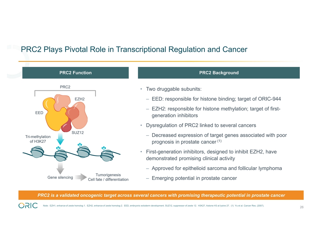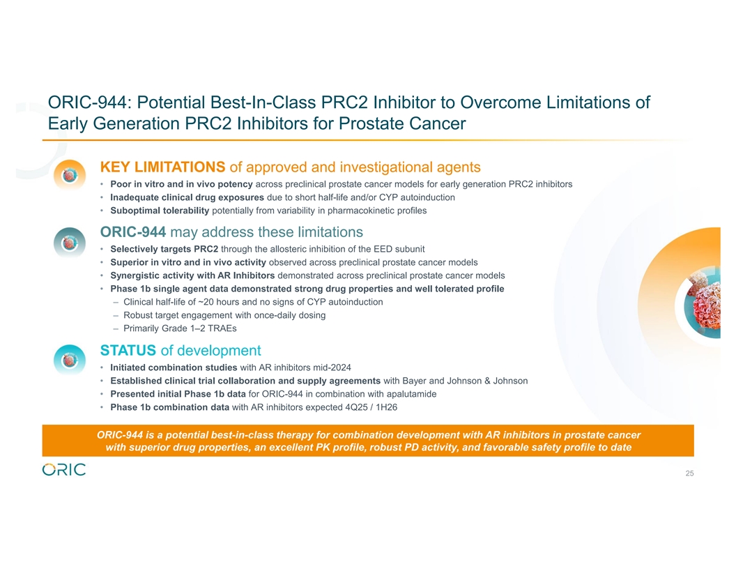 ORIC-944:潜在的同类最佳PRC2抑制剂,可克服早期PRC2抑制剂对前列腺癌的限制已批准和研究药物的关键限制•早期PRC2抑制剂在临床前前列腺癌模型中的体外和体内效力较差•由于半衰期短和/或CYP自诱导导致的临床药物暴露不足•可能来自药代动力学特征变异性的次优耐受性ORIC-944可能解决这些限制•通过EED亚基的变构抑制选择性靶向PRC2 •体外优越在临床前前列腺癌模型中观察到的和体内活性•在临床前前列腺癌模型中证明了与AR抑制剂的协同活性• 1b期单药数据显示出强大的药物特性和良好的耐受性特征–临床半衰期约为20小时,没有CYP自体诱导的迹象–每日一次给药的稳健靶点参与–主要是1– 2级TRAEs开发状态• 2024年年中启动与AR抑制剂的联合研究•与拜耳建立临床试验合作和供应协议和强生 •公布ORIC-944联合阿帕鲁胺的初步1b期数据•与AR抑制剂的1b期联合数据预计4Q25/1H26 ORIC-944是一种潜在的同类最佳疗法,用于与AR抑制剂联合开发前列腺癌,具有优越的药物特性、出色的PK特征、强大的PD活性和迄今为止良好的安全性25