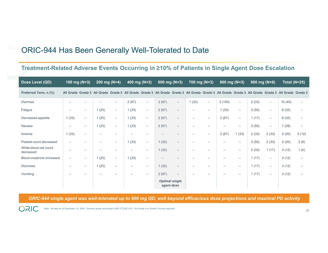 迄今为止,ORIC-944总体上具有良好的耐受性,≥ 10%的患者在单药剂量递增剂量水平(QD)100mg(N = 3)200mg(N = 4)400mg(N = 3)600mg(N = 3)700mg(N = 3)800mg(N = 3)900mg(N = 6)总(N = 25)优选期限,n(%)全部3级全部3级全部3级全部3级全部3级全部3级全部3级全部3级全部3级全部3级全部3级全部3级腹泻– –– –– 2(67)– 2(67)– 1(33)– 3(100)– 2(33)– 10(40)–疲劳– – 1(25)– 1(33)– 2(67)– –– 1(33)– 3(50)– 8(32)–食欲下降1(33)– 1(25)– 1(33)– 2(67)–– 2(67)– 1(17)– 8(32)–恶心– – 1(25)– 1(33)– 2(67)– –– –– 3(50)– 7(28)–贫血1(33)–– –– –– –– 2(67)1(33)2(33)2(33)5(20)3(12)血小板计数减少–– –– 1(33)– –– –– 3(50)2(33)5(20)2(8)白细胞计数–– –– –– 1(33)–– –– 2(33)1(17)3(12)1(4)血肌酐下降血肌酐增加–– 1(25)– 1(33)–– –– –– 1(17)– 3(12)–头晕–– 1(25)–– –– 1(33)–– –– –– 1(17)– 3(12)–呕吐–– –– –– –– 2(67)–– –– –– 1(17)– 3(12)–最佳单药剂量ORIC-944单药耐受性良好,最高可达900mg QD,远远超出有效剂量投射和最大PD活性注:所有数据截至2024年12月10日。根据NCI CTCAE v5.0的严重程度等级。没有报告4级或5级事件。38