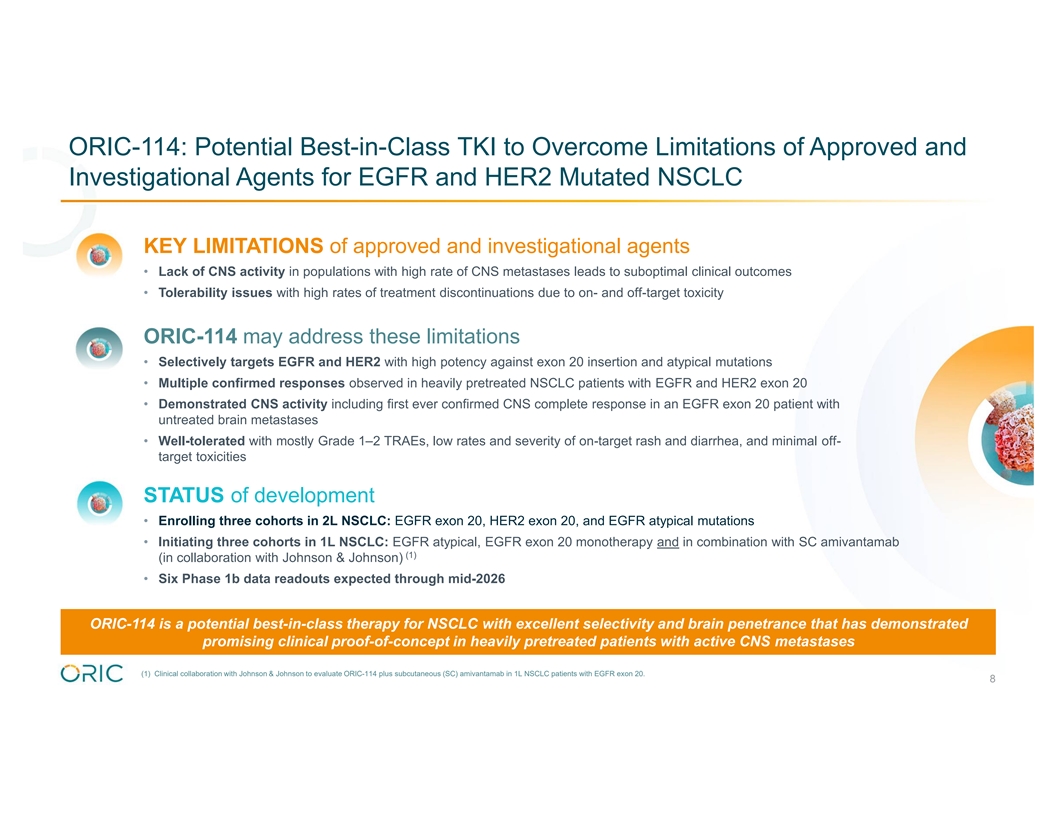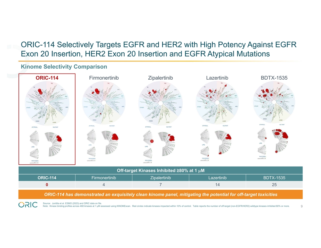 ORIC-114:潜在的同类最佳TKI,以克服EGFR和HER2突变NSCLC的批准和研究药物的限制已批准和研究药物的关键限制•在CNS转移发生率高的人群中缺乏CNS活性导致临床结果不理想•由于靶向和脱靶毒性导致治疗中断率高的耐受性问题ORIC-114可能会解决这些限制•选择性靶向EGFR和HER2,具有针对外显子20插入和非典型突变的高效力•在EGFR的大量预处理NSCLC患者中观察到多个确认的反应和HER2外显子20 •在一名未经治疗的脑转移瘤EGFR外显子20患者中显示出CNS活性,包括首次确认CNS完全应答•耐受性良好,大部分为1– 2级TRAEs,靶向皮疹和腹泻的发生率和严重程度较低,以及极小的脱靶毒性发展状态•在2L NSCLC中招募了三个队列:EGFR外显子20、HER2外显子20和EGFR非典型突变•在1L NSCLC中启动了三个队列:EGFR非典型,EGFR外显子20单药治疗和联合SC amivantamab(1)(与强生合作)•预计到2026年年中的六个1b期数据读数ORIC-114是一种潜在的同类最佳NSCLC疗法,具有出色的选择性和脑外显率,已在经过大量预处理的活动性CNS转移患者中证明了有希望的临床概念验证(1)与强生的临床合作,评估ORIC-114加皮下(SC)amivantamab在EGFR外显子20的1L NSCLC患者中的疗效。8