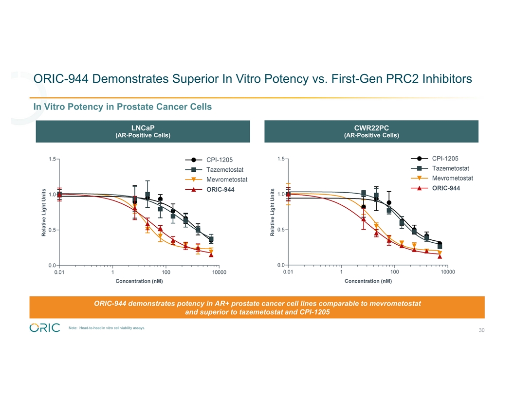 ORIC-944:合理设计的下一代PRC2抑制剂在前列腺癌CPI-1205中的潜在最佳PRC2抑制剂格局Tazemetostat Mevrometostat ORIC-944 st nd rd关键特征(1代)(1代)(2代)(3代)优于跨细胞潜能细胞潜能细胞潜能前列腺癌模型的ST1代方案ü提高了跨体内活性的单药和组合活性A体内活性潜能前列腺癌模型ü强药强药更高和更一致的特性临床暴露特性(PK、溶解度、无CYP自体诱导)ü持续靶点覆盖长临床长长临床和QD给药半衰期半衰期(~20小时半衰期)ü开发状态已终止已终止的3期试验正在进行的1b期正在进行的ORIC-944是一种潜在的同类最佳PRC2抑制剂,可解决早期PRC2抑制剂的局限性资料来源:Friedman等人AACR(2024)、Vaswani等人J Med Chem(2016)、Motwani等人和Bradley等人AACR-EORTC-NCI(2019)、Schweizer等人ESMO(2022)、Italiano等人Lancet(2018)和Harb等人TAT(2018)。注:药物特性包括吸收、CYP谱和代谢、药代动力学(PK)和溶解度谱。Tazemetostat被批准用于滤泡性淋巴瘤和上皮样肉瘤,但在前列腺癌方面的开发已经停止。29