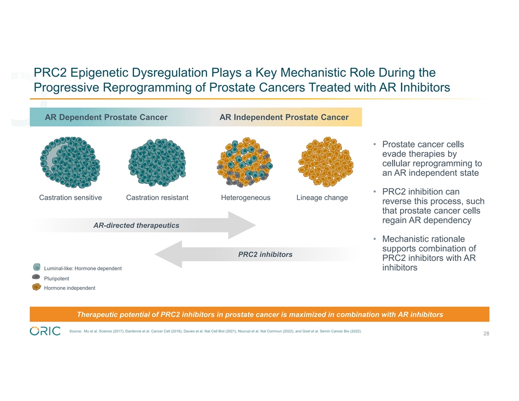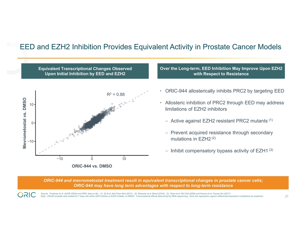 EED和EZH2抑制长期在前列腺癌模型中提供同等活性,EED抑制可能会在EZH2时改善EED和EZH2初始抑制时观察到的与耐药性相关的等效转录变化• ORIC-944通过靶向EED 2 R = 0.88变构抑制PRC2 •通过EED对PRC2的变构抑制可能会解决EZH2抑制剂的局限性(1)–对EZH2耐药PRC2突变体具有活性–通过EZH2(3)中的次级(2)突变来预防获得性耐药–抑制EZH1 ORIC-944与DMSO ORIC-944的代偿性旁路活性和mevrometostat治疗可在前列腺癌细胞中产生等效的转录变化;ORIC-944对于长期耐药可能具有长期优势资料来源:Friedman et al. AACR(2024)和存档的ORIC数据。(1)Qi et al. NAT Chem Biol(2017)。(2)Bisserier et al. Blood(2018)。(3)Shen et al. Mol Cell(2008)和Honma et al. Cancer Sci(2017)。注:LNCAP前列腺细胞用EED抑制剂或EZH2抑制剂治疗7天vs DMSO。RNA测序确定的转录效应。每个点代表一个基因通过治疗的差异表达(t统计)。27 Mevrometostat vs. DMSO