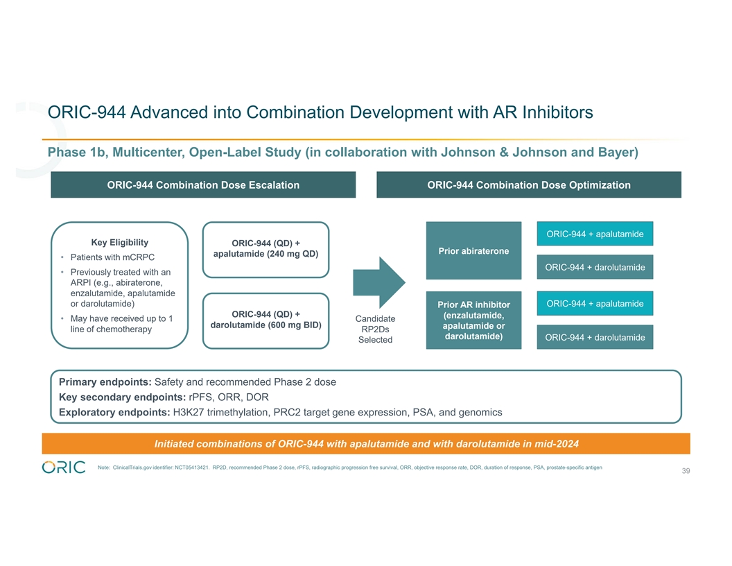 ORIC-944进入与AR抑制剂的联合开发1b期、多中心、开放标签研究(与强生和拜耳合作)ORIC-944联合剂量递增ORIC-944联合剂量优化ORIC-944 +阿帕鲁胺关键资格ORIC-944(QD)+先前阿比特龙阿帕鲁胺(240mg QD)• mCRPC ORIC-944 + darolutamide患者•先前接受过ARPI(例如阿比特龙、恩杂鲁胺、阿帕鲁胺或达洛鲁胺)治疗的ORIC-944 +阿帕鲁胺先前AR抑制剂ORIC-944(QD)+(恩杂鲁胺,•可能已接受多达1个候选药物达鲁鲁胺(600mg BID)阿帕鲁胺或行化疗RPDDs达鲁鲁胺)ORIC-944 +达鲁鲁胺选定的主要终点:安全性和推荐的2期剂量关键次要终点:rPFS、ORR、DOR探索性终点:H3K27三甲基化、PRC2靶基因表达、PSA和基因组学在2024年中期启动了ORIC-944与阿帕鲁胺和达鲁胺的组合注:ClinicalTrials.gov标识符:NCT05413421。RPTD、推荐2期剂量、RPFS、影像学无进展生存期、ORR、客观缓解率、DOR、应答持续时间、PSA、前列腺特异性抗原39