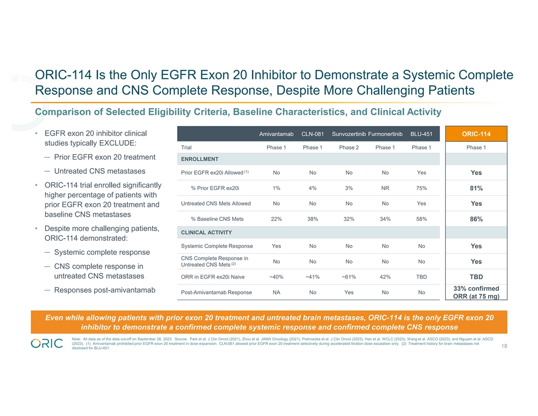 EGFR外显子20突变NSCLC和活动性CNS转移患者在既往EGFR外显子20靶向治疗中确认完全颅内和系统应答进展•患者:55F伴EGFR外显子20突变NSCLC •既往治疗:培美曲塞/顺铂和阿米万他单抗•基线时的转移:四个活动性CNS非靶向病变─既往未治疗─既往未手术─既往未放射基线第2周期结束:完全应答• ORIC-114剂量:75mg QD •系统应答:第1周期后部分应答(所有靶点减少60%和非靶点病变)随后在第2周期结束时完全缓解(所有靶点和非靶点病变减少100%),随后确认• CNS应答:第1周期后完全缓解(所有4个CNS病变减少100%)在第2周期后确认• ≥ 2级治疗相关AEs:2级粘膜炎和甲沟炎•治疗持续时间:第9周期(进行中)基线(显示的4个病变中有1个)第1周期结束:完全缓解ORIC-114在关键癌症和分子亚型中显示单药临床活性(即,NSCLC和EGFR外显子20)在一名通常被排除在临床试验之外(即活动性脑转移)且既往接受过EGFR外显子20治疗的患者中注:截至2023年9月26日数据截止的所有数据。17