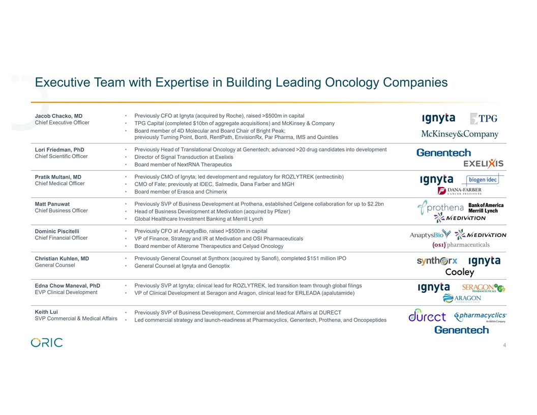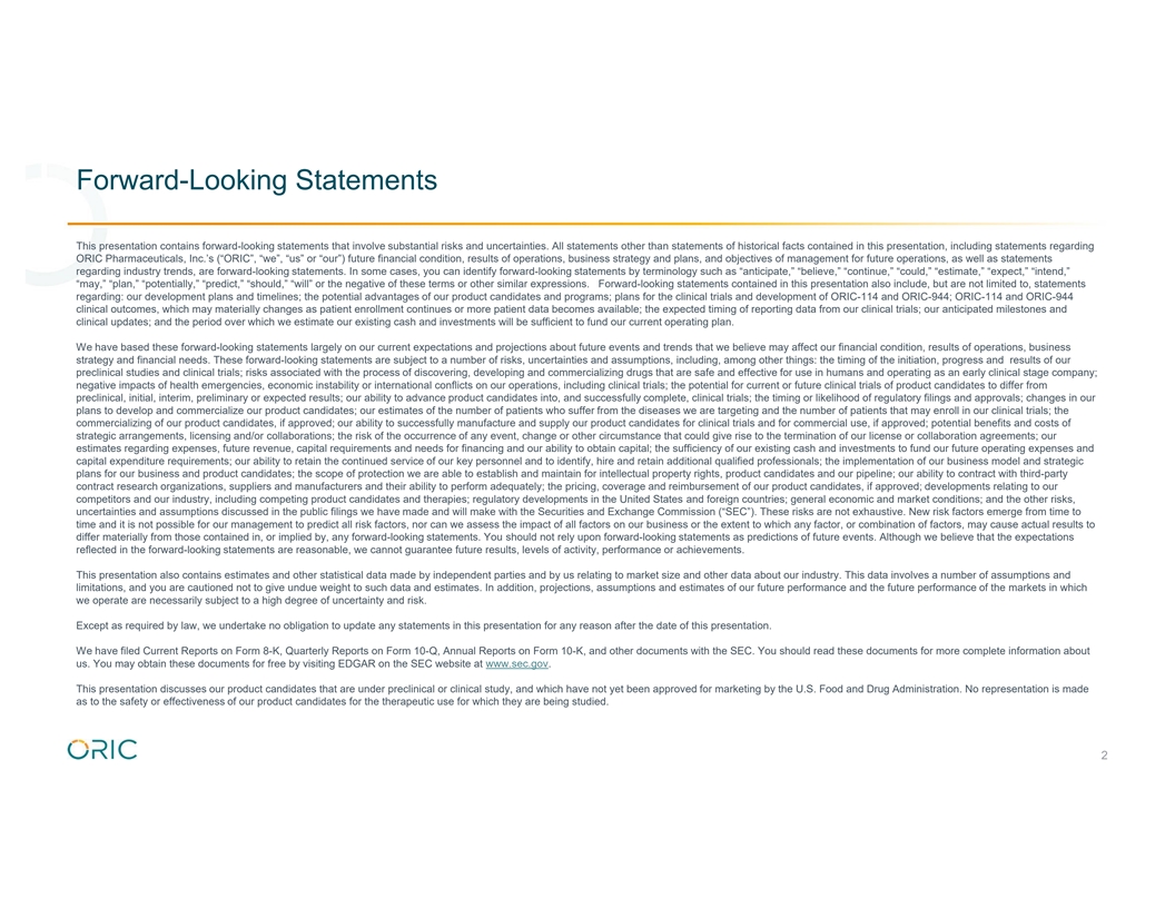 前瞻性陈述本演示文稿包含涉及重大风险和不确定性的前瞻性陈述。本演示文稿中除历史事实陈述外的所有陈述,包括关于ORIC制药,Inc.(“ORIC”、“我们”、“我们”或“我们的”)未来财务状况、经营成果、业务战略和计划、管理层对未来经营的目标的陈述,以及关于行业趋势的陈述,均为前瞻性陈述。在某些情况下,您可以通过“预期”、“相信”、“继续”、“可能”、“估计”、“预期”、“打算”、“可能”、“计划”、“可能”、“预测”、“应该”、“将”或这些术语的否定或其他类似表达等术语来识别前瞻性陈述。本演示文稿中包含的前瞻性陈述还包括但不限于以下方面的陈述:我们的开发计划和时间表;我们的候选产品和项目的潜在优势;ORIC-114和ORIC-944的临床试验和开发计划;ORIC-114和ORIC-944临床结果,随着患者入组的继续或更多患者数据的可用,可能会发生重大变化;报告我们临床试验数据的预期时间;我们预期的里程碑和临床更新;以及我们估计现有现金和投资将足以为我们当前的运营计划提供资金的期间。我们的这些前瞻性陈述主要基于我们目前对未来事件和趋势的预期和预测,我们认为这些事件和趋势可能会影响我们的财务状况、经营业绩、业务战略和财务需求。这些前瞻性陈述受到许多风险、不确定性和假设的影响,其中包括:我们的临床前研究和临床试验的启动时间、进展和结果;与发现、开发和商业化可安全有效地用于人类并作为早期临床阶段公司运营的药物的过程相关的风险;卫生紧急情况、经济不稳定或国际冲突对我们的运营(包括临床试验)的负面影响;产品候选者当前或未来临床试验与临床前、初始、中期、初步或预期结果;我们将产品候选者推进并成功完成临床试验的能力;监管备案和批准的时间或可能性;我们开发和商业化我们的产品候选者的计划的变化;我们对患有我们所针对的疾病的患者数量以及可能参加我们的临床试验的患者数量的估计;如果获得批准,我们的产品候选者的商业化;如果获得批准,我们成功制造和供应用于临床试验和商业用途的产品候选者的能力;战略安排的潜在收益和成本,许可和/或合作;可能导致我们的许可或合作协议终止的任何事件、变化或其他情况发生的风险;我们对费用、未来收入、资本要求和融资需求以及我们获得资本的能力的估计;我们现有的现金和投资是否足以为我们未来的运营费用和资本支出需求提供资金;我们保留关键人员的持续服务的能力,以及确定,雇用和留住更多合格的专业人员;实施我们的业务模式和业务和产品候选者的战略计划;我们能够为知识产权、产品候选者和我们的管道建立和维持的保护范围;我们与第三方合同研究组织、供应商和制造商签订合同的能力及其充分履行的能力;如果获得批准,我们的产品候选者的定价、覆盖范围和报销;与我们的竞争对手和我们行业相关的发展,包括竞争产品候选者和疗法;美国和外国的监管发展;总体经济和市场状况;以及我们已向美国证券交易委员会(“SEC”)提交并将向其提交的公开文件中讨论的其他风险、不确定性和假设。这些风险并非详尽无遗。新的风险因素不时出现,我们的管理层无法预测所有风险因素,我们也无法评估所有因素对我们业务的影响,或任何因素或因素组合可能在多大程度上导致实际结果与所包含或暗示的结果存在重大差异, 任何前瞻性陈述。你不应该依赖前瞻性陈述作为对未来事件的预测。尽管我们认为前瞻性陈述中反映的预期是合理的,但我们无法保证未来的结果、活动水平、业绩或成就。本演示文稿还包含独立方和我们就市场规模和有关我们行业的其他数据作出的估计和其他统计数据。这些数据涉及许多假设和限制,请注意不要对这些数据和估计给予过度的权重。此外,对我们未来业绩的预测、假设和估计以及我们经营所在市场的未来业绩必然受到高度不确定性和风险的影响。除法律要求外,我们不承担在本演示文稿日期之后以任何理由更新本演示文稿中的任何声明的义务。我们已经向SEC提交了8-K表格的当前报告、10-Q表格的季度报告、10-K表格的年度报告以及其他文件。您应该阅读这些文件以获得有关我们的更完整信息。您可以通过访问SEC网站www.sec.gov上的EDGAR免费获得这些文件。本演示文稿讨论了我们正在进行临床前或临床研究、尚未获得美国食品和药物管理局批准上市的候选产品。对于我们的候选产品用于其正在研究的治疗用途的安全性或有效性,不作任何表示。2