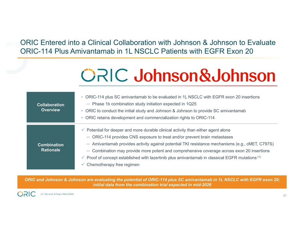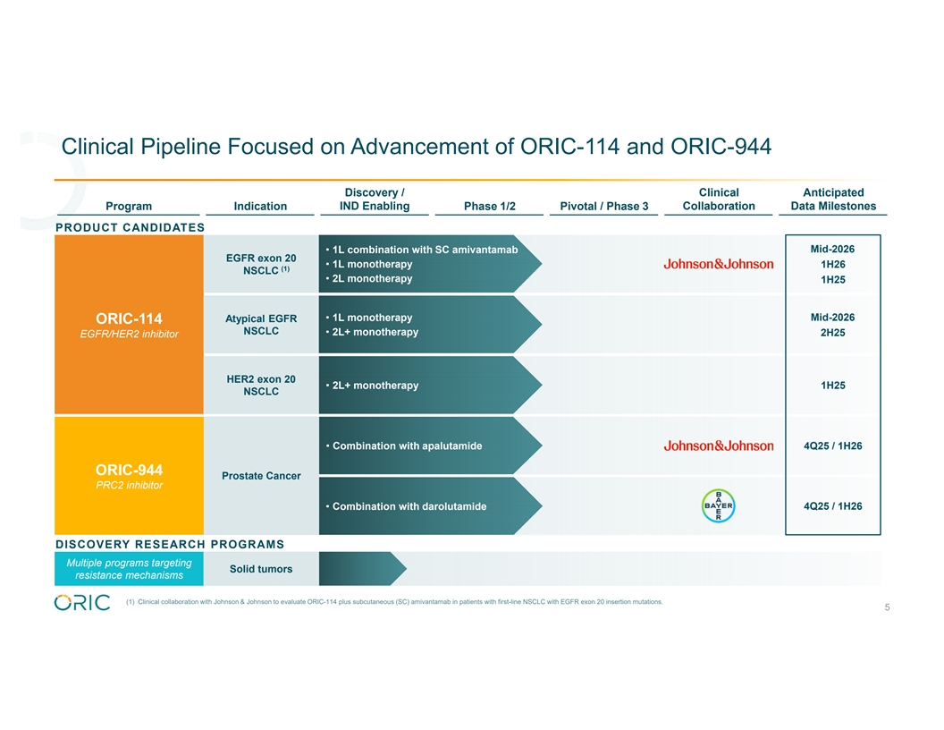 ORIC制药:致力于克服癌症中的耐药性•潜在的同类最佳TKI靶向具有EGFR外显子20、HER2外显子20和EGFR非典型突变的NSCLC导致项目向关键研究推进•潜在的同类最佳PRC2抑制剂靶向mCRPC •基于内部研发和外部业务发展的管道扩展双引擎构建的管道•每18个月针对一名新的IND候选者•发现、开发和商业化肿瘤疗法的传统,是在Ignyta、Medivation、Aragon、Pharmacyclics的经验丰富的管理团队,和基因泰克(1)强劲的财务状况• 2.82亿美元的现金和投资预计将为公司提供资金到2026年末• ORIC-114(NSCLC):─ 1H25:2L EGFR外显子20和2L + HER2外显子20 ─ 2H25:2L + EGFR非典型─ 1H26:1L EGFR外显子20预期数据里程碑─ 2026年中:1L EGFR外显子20联合SC amivantamab和1L EGFR非典型• ORIC-944(mCRPC):─ 4Q25/1H26:联合AR抑制剂两个潜在的同类最佳项目预计将在2H25(ORIC-114)和2026年初(ORIC-944)进入关键研究(1)截至9月的未经审计余额3