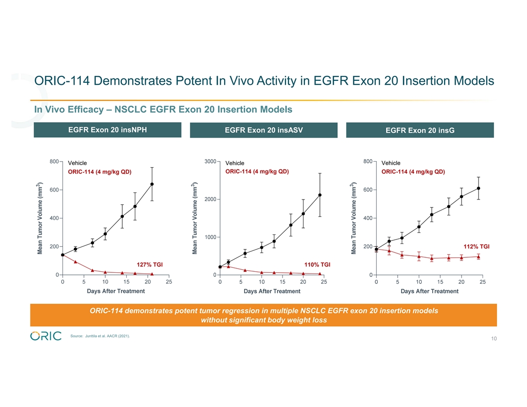 ORIC-114选择性靶向EGFR和HER2对EGFR外显子20插入、HER2外显子20插入和EGFR非典型突变Kinome选择性比较ORIC-114 Firmonertinib Zipalertinib Lazertinib BDTX-1535脱靶激酶在1mM时抑制≥ 80% ORIC-114 Firmonertinib Zipalertinib Lazertinib BDTX-1535 0471425 ORIC-114已展示了一个精致干净的kinome panel,减轻了脱靶毒性的可能性来源:Junttila et al. ESMO(2023)和存档的ORIC数据。注意:使用KINOMEScan评估1 μ M下468种激酶的激酶结合谱。红圈表示激酶在控制范围的10%范围内受到影响。表报告了脱靶(非EGFR/HER2)野生型激酶抑制80%或更多的数量。9
