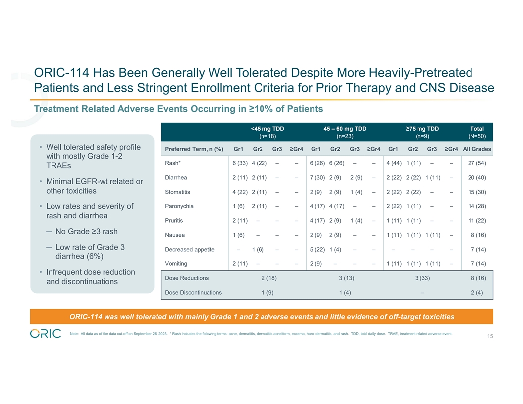 ORIC-114 1期患者处置和基线特征患者处置和基线特征EGFR ex20 HER2 ex20 HER2 +总(n = 21)(n = 24)(n = 5)(N = 50)63(31,80)63(25,86)66(48,68)63(25,86)年龄、年龄、中位数(范围)• 50例患者接受10(48)11(46)3(60)24(48)女性,n(%)增加剂量ORIC-114 ECOG性能评分,n(%)• NSCLC患者中1(5)10(42)3(60)14(28)0 EGFR外显子2020(95)14(58)2(40)36(72)112(57)16(68)3(60n(%)─ ≥ 1个既往EGFR ex20:81% 2(1,6)2(0,7)4(1,7)2(0,7)既往治疗线,中位数(min,max)─ ≥ 2个既往EGFR ex20:19%既往治疗,n(%)21(100)23(96)5(100)49(98)化疗─ CNS mETs基线:86% 18(86)1(4)– 19(38)EGFR靶向药物• NSCLC患者中EGFR外显子20靶向药物17(81)–– 17(34)HER2外显子20 Amivantamab 15(71)–– 15(30)Mobocertinib 4(19)–– 4(8)─ ≥ 1先前HER2药物:30%其他(CLN-081,BLU-451)2(10)–– 2(4)─基线时的CNS mets:38% HER2靶向药物– 7(30)3(60)10(20)18(86)9(38)1(20)28(56)基线时的CNS转移,n(%)1b期入组大量预处理的患者,先前的20外显子靶向治疗和基线时的CNS转移率极高注:截至2023年9月26日数据截止的所有数据。14