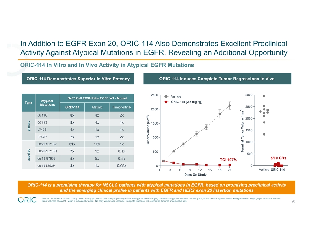 除了EGFR外显子20,ORIC-114还表现出针对EGFR非典型突变的出色临床前活性,在体外揭示一个额外的机会ORIC-114和非典型EGFR突变ORIC-114的体内活性显示出卓越的体外效力ORIC-114在体内诱导完全肿瘤回归3000 baF3细胞EC50比EGFR WT/突变非典型型突变2500 ORIC-114阿法替尼Firmonertinib G719C 8x 4x 2x 2000 G719S 9x 4x 1x L747S 1x 1x 1x 1500 L747P 2x 1x 2x 1000 L858R L718V 31x 13x 1x L858R L718Q 7x 1x 0.1x 5005/10 CRS del19 G796S 5x 5x 0.5x TGI 107% del19 L792H 3x 1x 0.09x 0车辆基于有希望的临床前活性和在EGFR和HER2外显子20插入突变患者中正在出现的临床概况资料来源:Junttila等人,ESMO(2023)。注:左图,BA/F3细胞稳定表达EGFR野生型或携带经典或非典型突变的EGFR。中图,EGFR G719S非典型突变异种移植模型。右图:第21天的个体末端肿瘤体积。均值用一条线表示。未观察到体重减轻。完全应答,CR,定义为大小无法检测到的肿瘤。20获得性原发性3肿瘤体积(mm)
