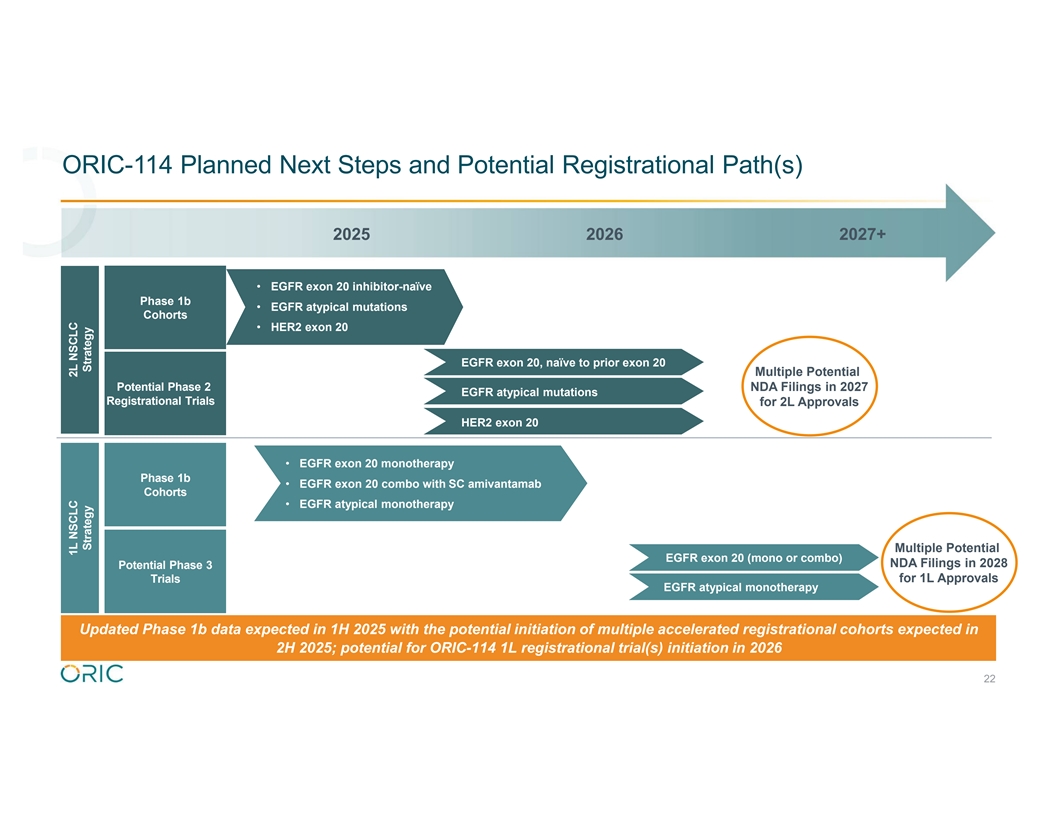 ORIC与强生进行临床合作,在EGFR外显子20的1L NSCLC患者中评估ORIC-114 plus amivantamab • ORIC-114 plus SC amivantamab将在EGFR外显子20插入的1L NSCLC中进行评估─ 1b期联合研究预计将于1Q25启动合作综述• ORIC进行初步研究,强生提供SC amivantamab • ORIC保留ORIC-114的开发和商业化权利ü潜在的更深并且比单独使用任何一种药物都具有更持久的临床活性─ ORIC-114提供CNS暴露以治疗和/或预防脑转移─ Amivantamab提供针对潜在TKI耐药机制的活性(例如,cMET,C797S)联合使用的理由─联合使用可能提供跨外显子20插入的更有效和更全面的覆盖(1)ü使用lazertinib加amivantamab在经典EGFR突变中建立的概念验证ü无化疗方案ORIC和强生正在评估ORIC-114加SC amivantamab在EGFR外显子20的1L NSCLC中的潜力;预计在2026年年中进行的联合试验的初步数据(1)Cho et al. N Engl J Med(2024)。21