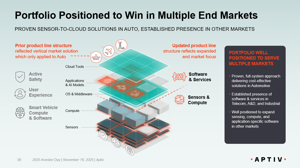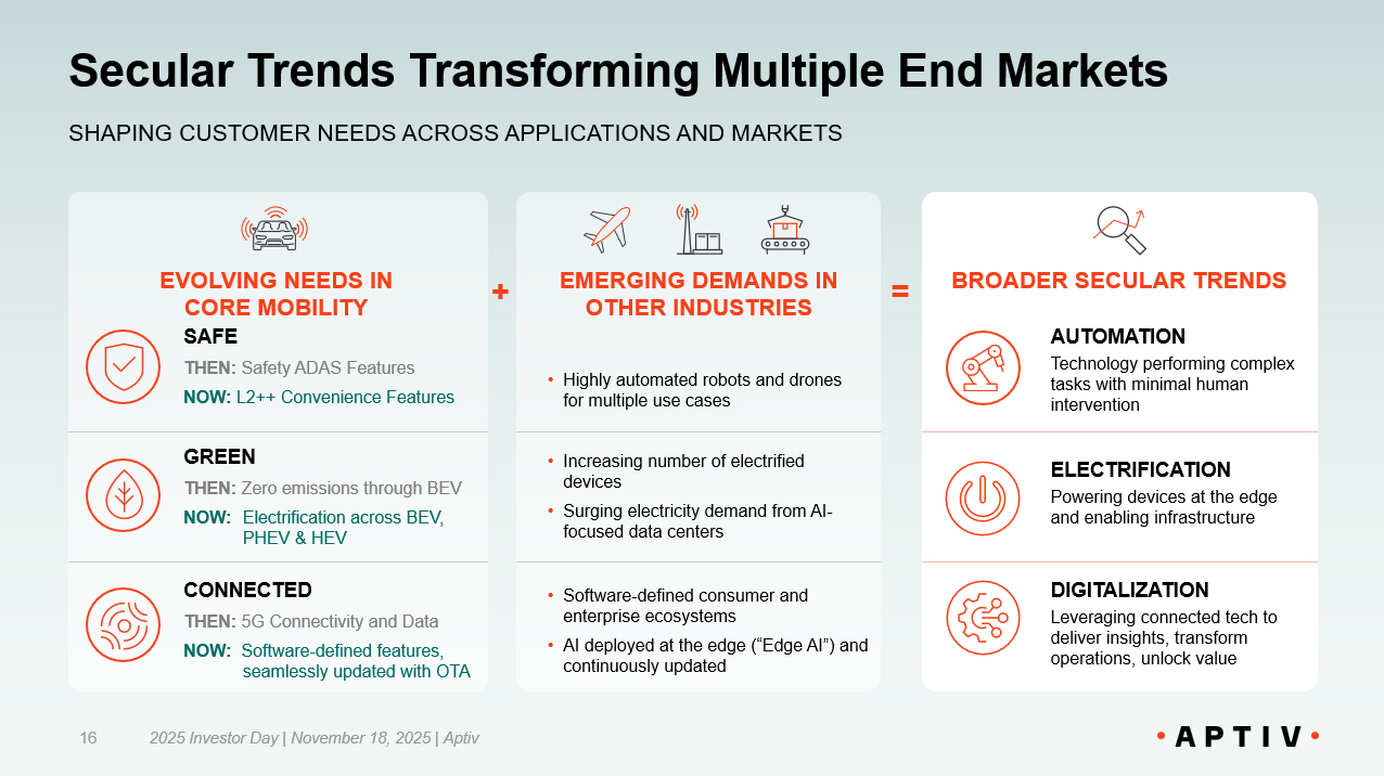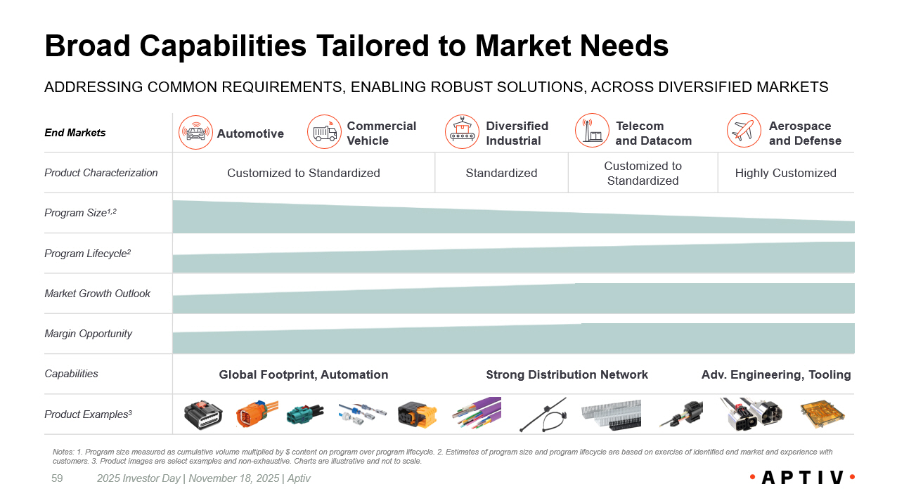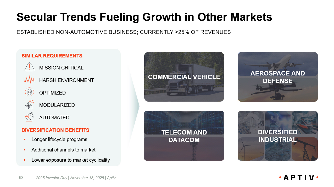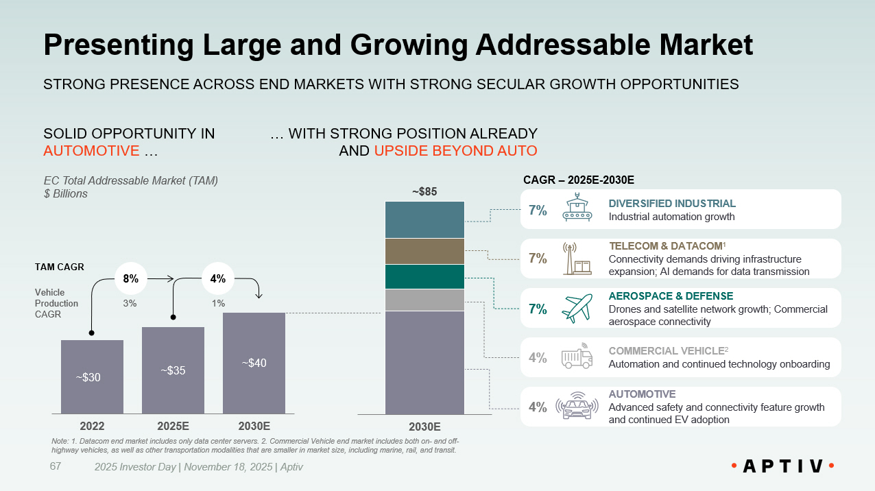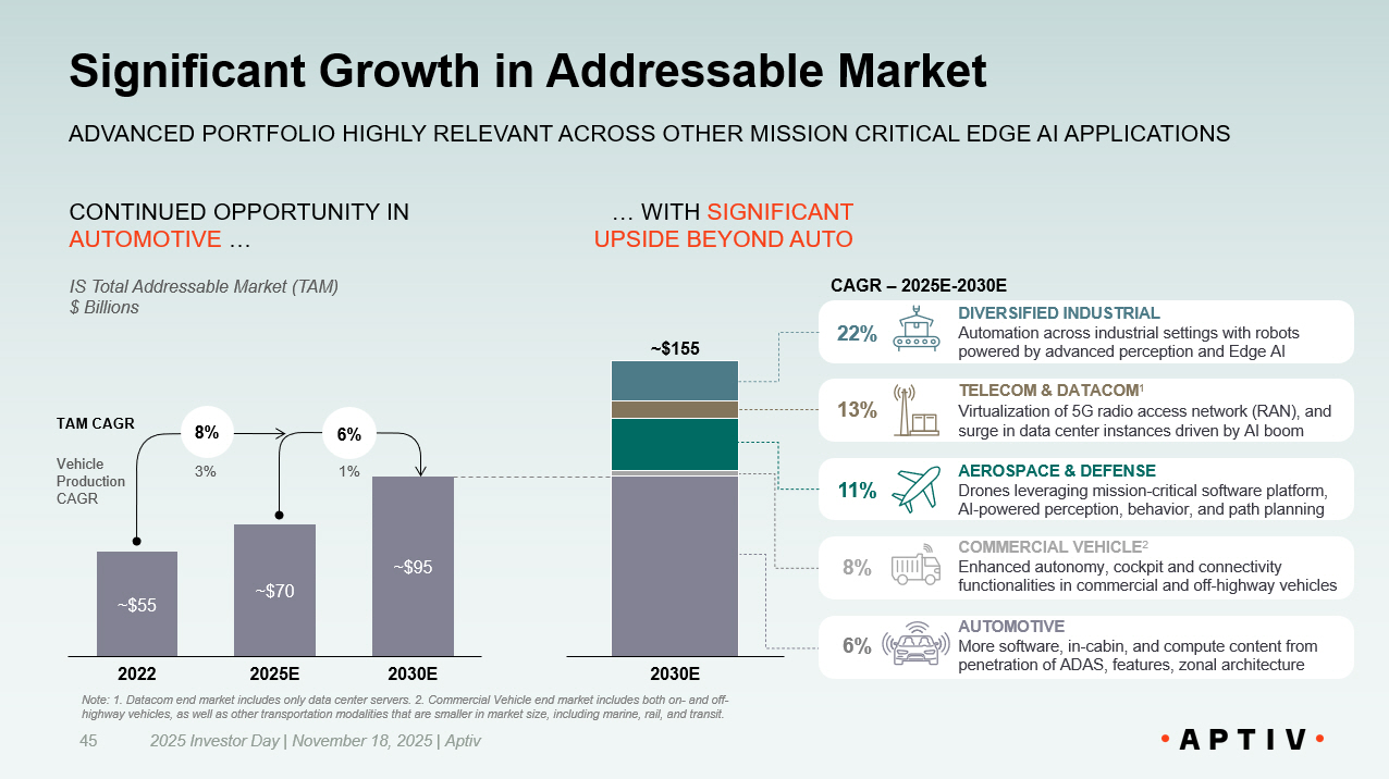 呈现巨大且不断增长的市场机会2025投资者日| 2025年11月18日| Aptiv 24个更广泛的终端市场机会为增长和利润率扩张提供了顺风,新的TERM0总可寻址市场(TAM)价值数十亿美元的航空航天和国防飞机升级、无人机部署,商业太空企业Automotive越来越多的软件定义车辆2030 E~$ 240 TELECOM & DATACOM 1 5G基础设施和AI数据中心的持续建设使工业多样化自动化程度提高,利用先进的机器人商业车辆2增强了商用和非公路车辆的自主性和舱内功能NEW APTIV在Automotive…5% 10% 9% 14% CAGR – 2025E-2030E 5%~$ 852022~$ 1052025 E~$ 1352030 E 5% 8% 3% 1% TAM CAGR车辆产量CAGR注:1。数通端市场仅包括数据中心服务器。2.商用车终端市场包括公路上和非公路车辆,以及市场规模较小的其他运输方式,包括船用、铁路和tra nsi t。…随着其他行业的上涨