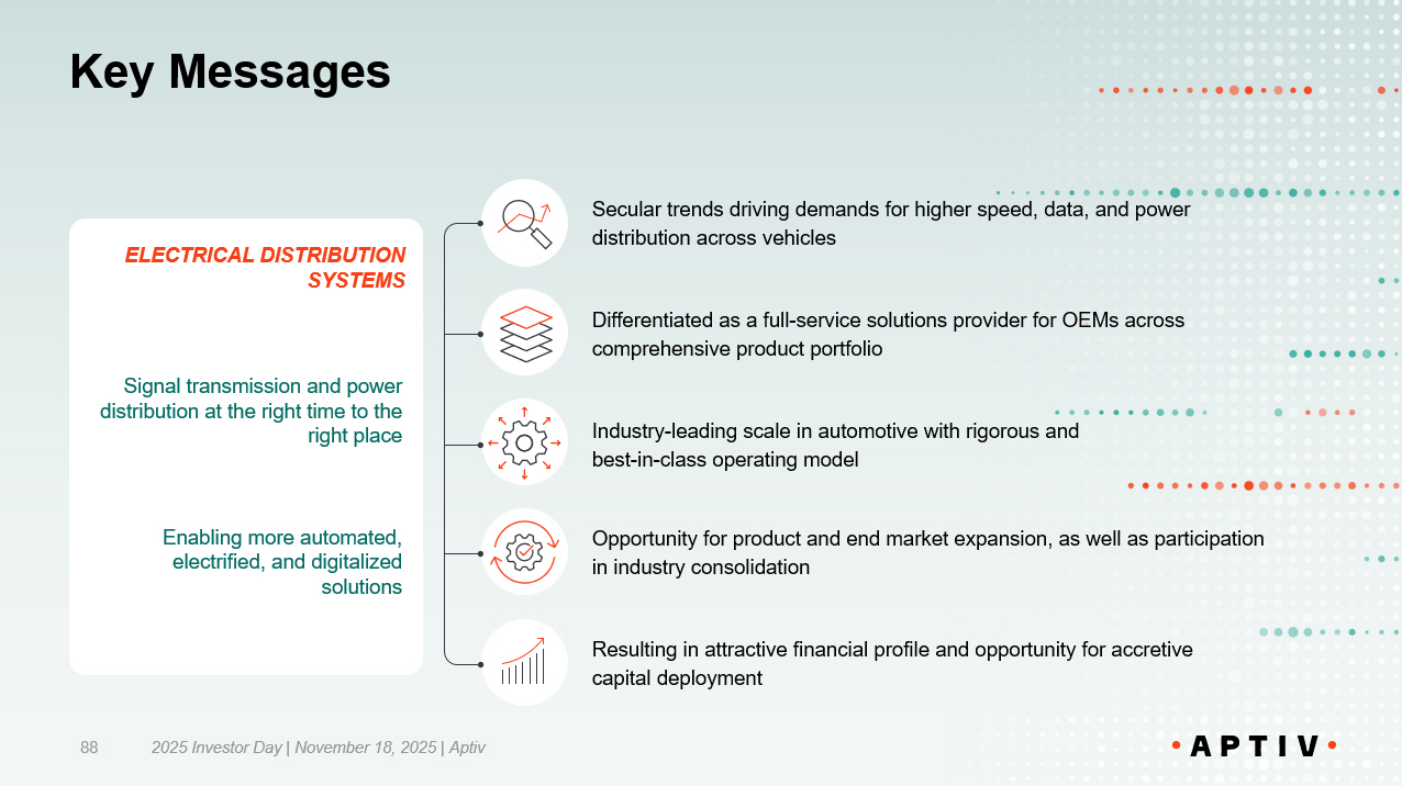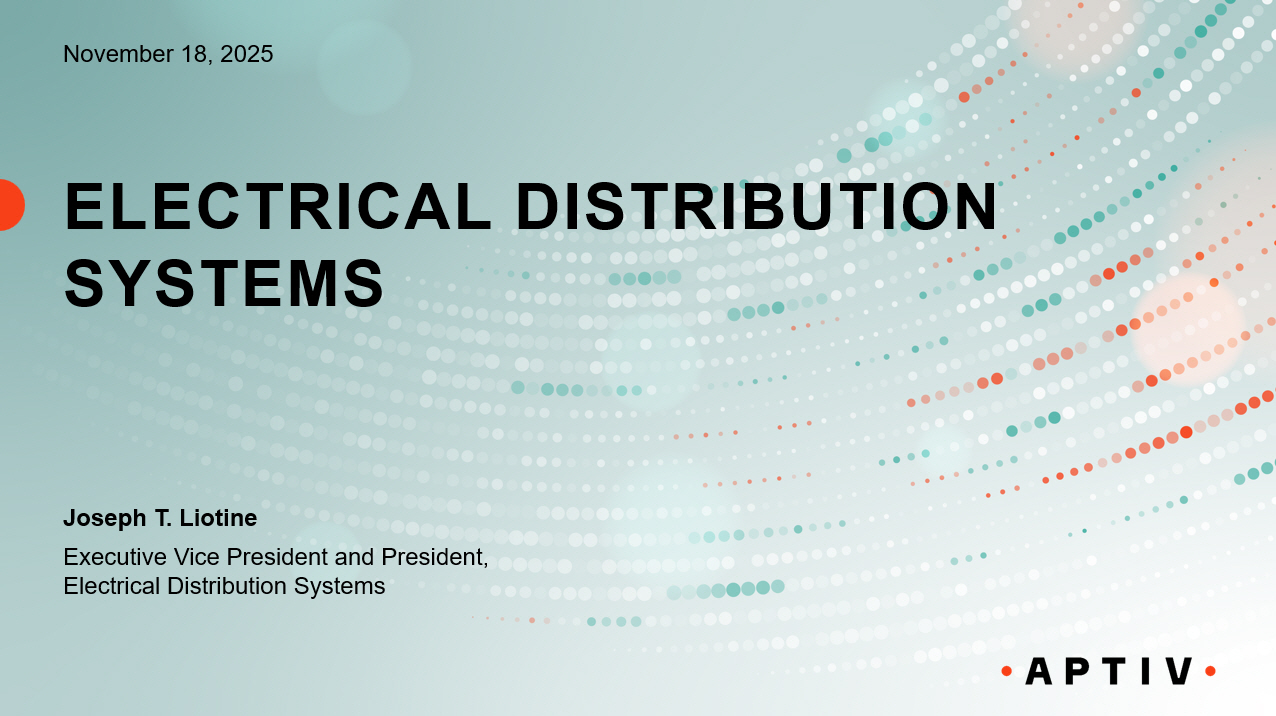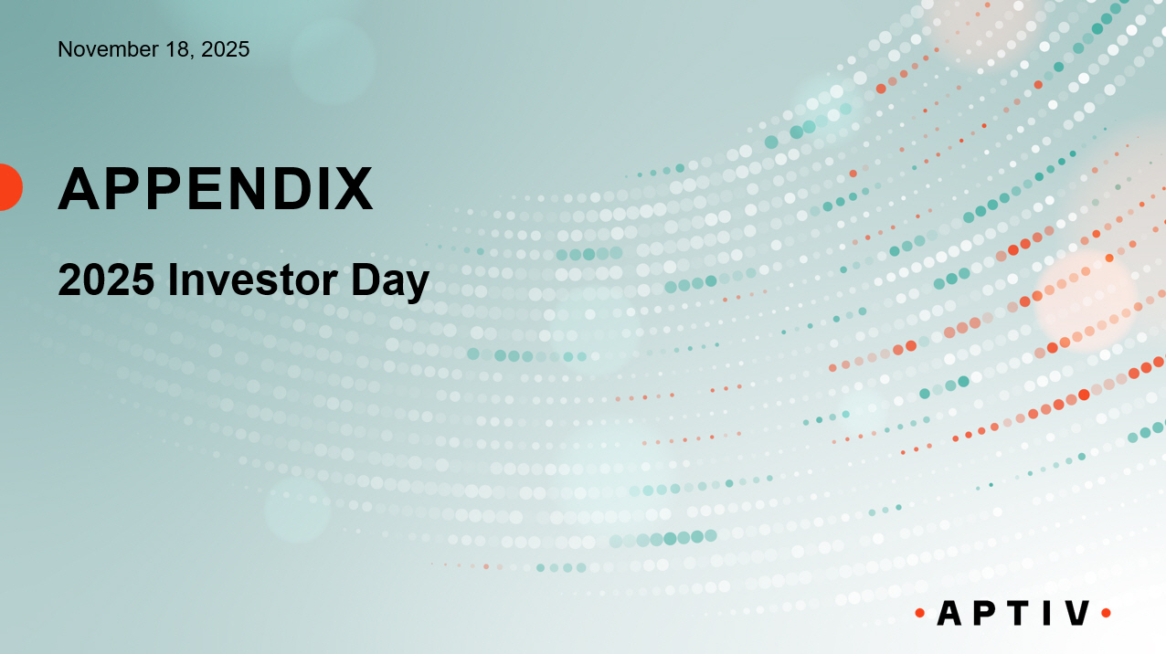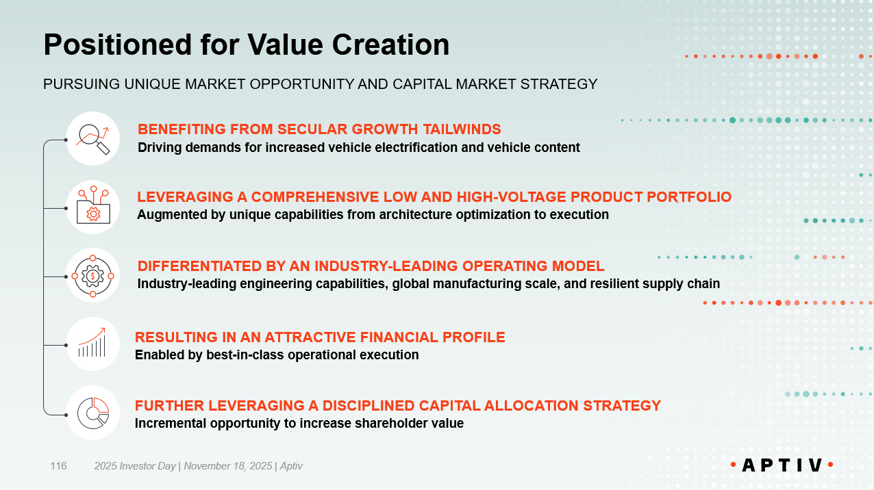 2025投资者日| 2025年11月18日| Aptiv 116进一步撬动有纪律的资本分配战略增量机会,以增加股东价值,从而形成由一流运营执行所支持的有吸引力的财务状况,定位于追求独特市场机会的价值创造和受益于秘密增长的资本市场战略的尾风,推动对汽车电气化和汽车内容增加的需求,撬动一个全面的低电压和高电压产品组合,由和有弹性的供应链
