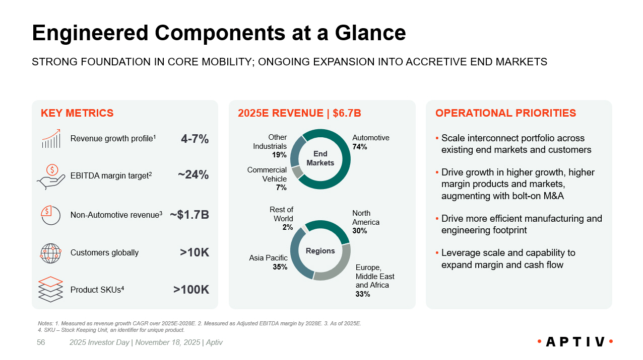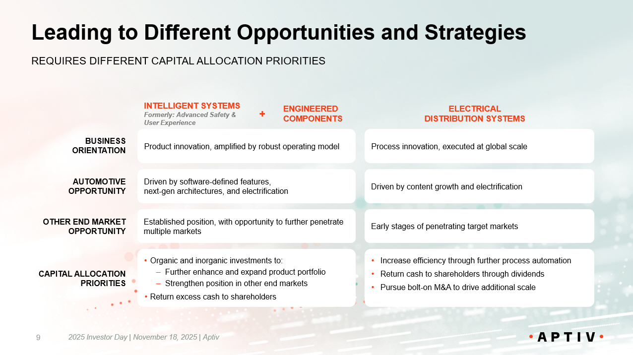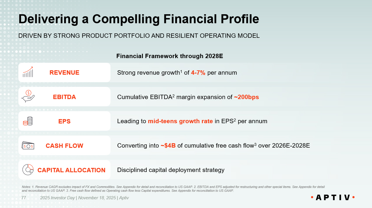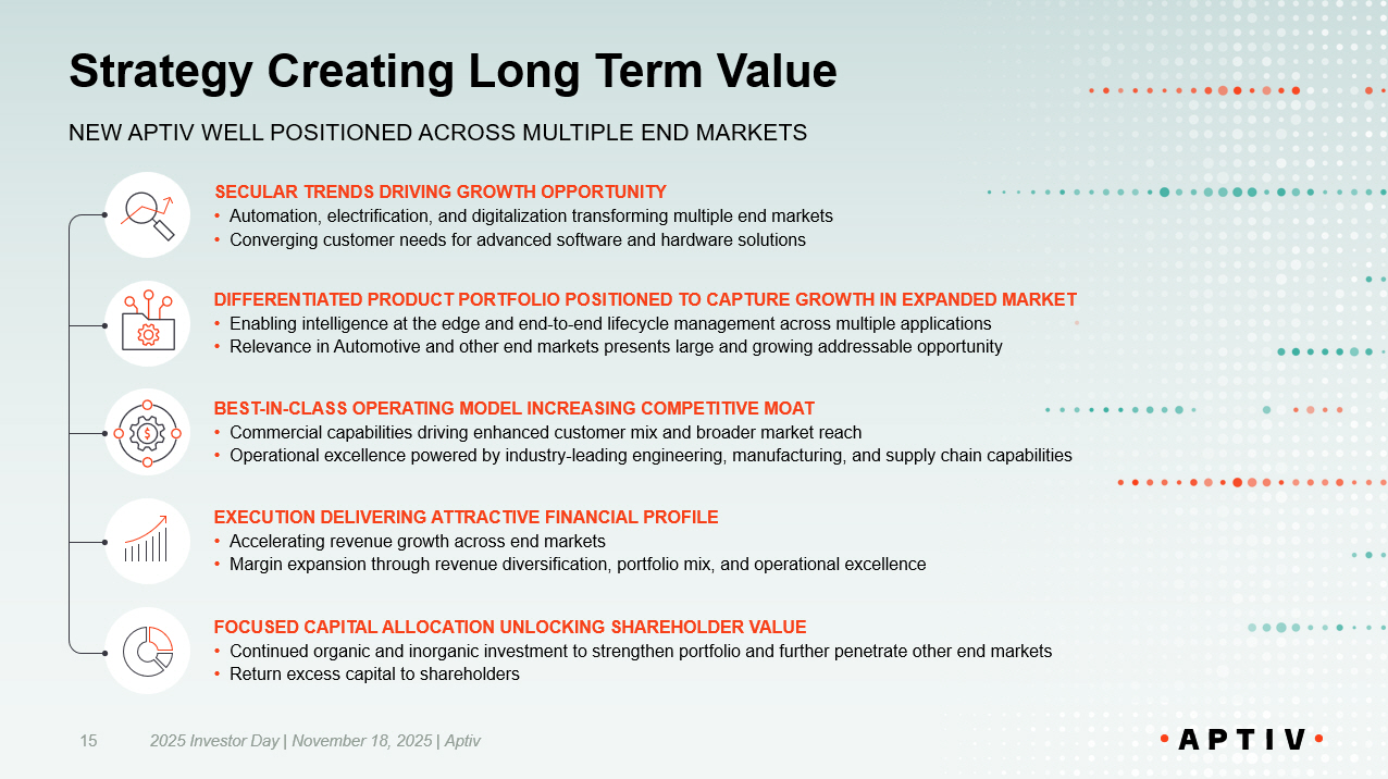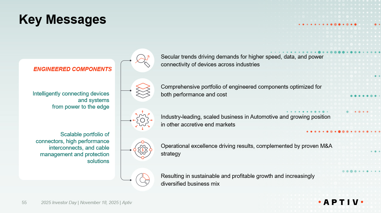 2025投资者日| 2025年11月18日| Aptiv 116进一步撬动有纪律的资本分配战略增量机会,以增加股东价值,从而形成由一流运营执行所支持的有吸引力的财务状况,定位于追求独特市场机会的价值创造和受益于秘密增长的资本市场战略的尾风,推动对汽车电气化和汽车内容增加的需求,撬动一个全面的低电压和高电压产品组合,由和有弹性的供应链