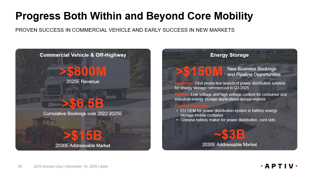 > 8亿美元的2025E收入进展在Core Mobility 2025内外投资者日| 11月18日,2025 | Aptiv 98证明在商用车方面的成功和在新MA RKETS商用车和非公路储能方面的早期成功> $ 15B 2030E可寻址市场> $ 6.5B在2022-2025E~$ 3B 2030E可寻址市场的累计预订量新的业务预订量和管道机会> $ 1.5亿•发布:用于储能的配电解决方案的首次生产发布于2025年Q3开始•奖项:面向消费者的低压和高压内容和跨区域工业储能应用•管道实例:•电池储能移动容器中配电系统的欧盟OEM •配电、帘子组的中国电池制造商