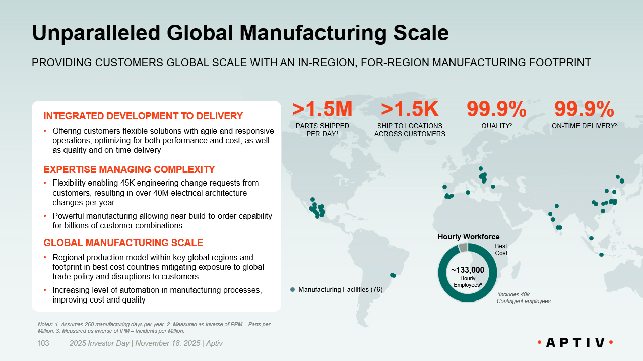 无与伦比的全球制造业规模2025投资者日| 2025年11月18日| Aptiv 103为客户全球规模提供in-region,for-region manufacturing footPRINT notes:1。假设每年260个制造天数。2.测量为PPM的反比–百万分之。3.衡量为IPM的反比–每百万的事件。交付的综合开发•为客户提供灵活的解决方案,具有敏捷和响应迅速的操作,优化性能和成本,以及质量和准时交付的专业管理复杂性•灵活性使客户提出的45K工程变更请求成为可能,导致每年超过40m的电气架构变化•强大的制造能力允许为数十亿个客户组合提供近乎按订单建造的能力全球制造规模•全球关键区域内的区域生产模式和最佳成本国家的足迹,减轻了全球贸易政策的风险和对客户的干扰•提高制造过程的自动化水平,提高成本和质量每小时劳动力的最佳成本~133,000名每小时雇员**包括40k名或有雇员制造设施(76)99.9%质量2 > 1.5k船到跨客户地点99.9%准时交付3 >每天运送150万件零件1
