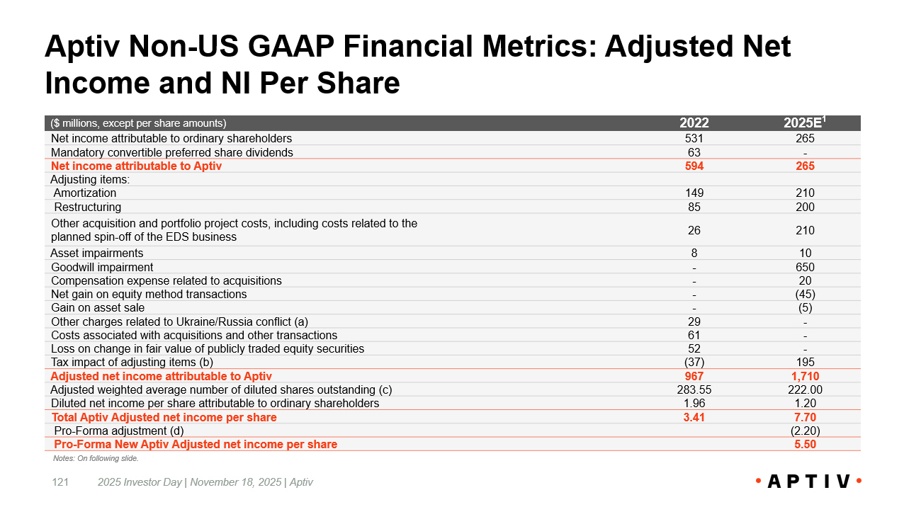 Aptiv非美国通用会计准则财务指标:调整后的净收入和每股NI 2025投资者日| 2025年11月18日| Aptiv 121 2025E 12022(百万美元,每股金额除外)265531归属于普通股东的净利润-63强制性可转换优先股股息265594归属于Aptiv的净利润调整项目:210149摊销20085重组21026其他收购和投资组合项目成本,包括与计划分拆EDS业务相关的成本108资产减值650-商誉减值20-与收购相关的补偿费用(45)-权益法交易净收益(5)-资产出售收益-29与乌克兰/俄罗斯冲突相关的其他费用(a)-61与收购相关的成本及其他交易-52公开交易股本证券的公允价值变动损失195(37)调整项目的税务影响(b)1,710967归属于Aptiv的调整后净利润222.00283.55调整后稀释后流通股加权平均数(c)1.20 1.96归属于普通股股东的稀释后每股净收益7.70 3.41合计Aptiv调整后每股净收益(2.20)备考调整(d)5.50备考新的Aptiv调整后每股净收益注:在以下幻灯片中。