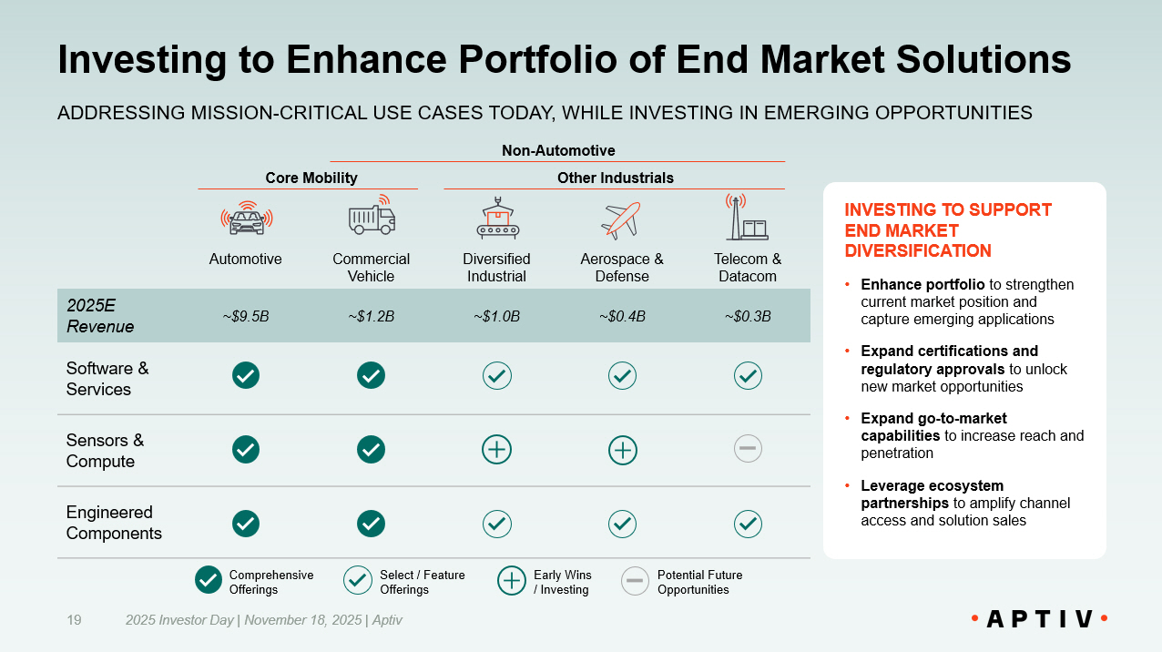 汽车能力转化为其他市场2025投资者日| 2025年11月18日| Aptiv 97使收入多样化,并确定具有有吸引力的EC本体和产品需求使用权的市场优化设计任务关键业务需求端到端能力全球规模和供应链特性支持额外机会战略焦点市场