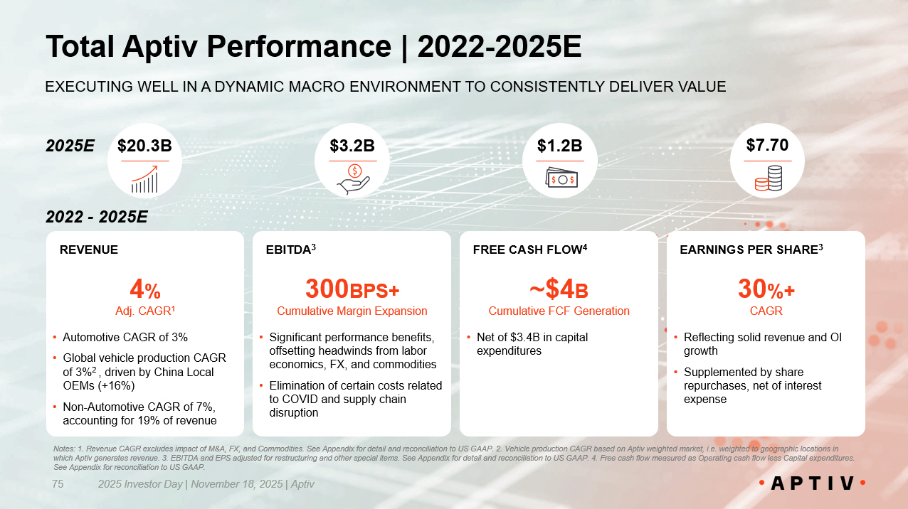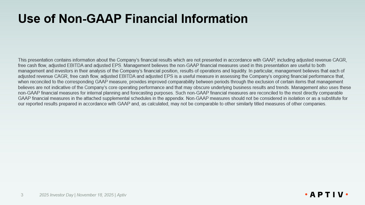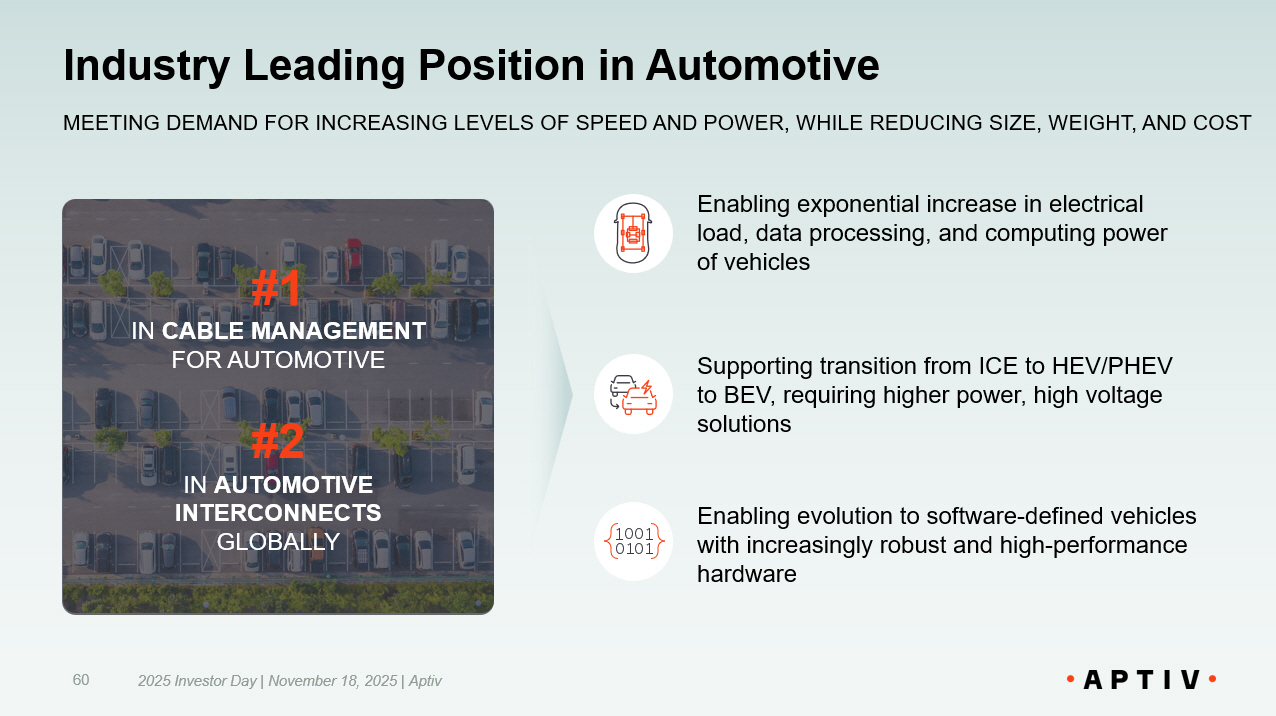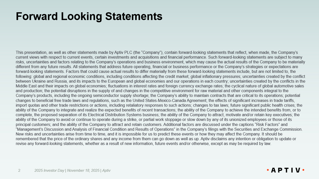 前瞻性陈述本演示文稿以及Aptiv PLC(“公司”)作出的其他陈述均包含前瞻性陈述,这些陈述在作出时反映了公司目前对当前事件、某些投资和收购以及财务业绩的看法。此类前瞻性ng报表受到与公司运营和商业环境有关的许多风险、不确定性和因素的影响,这可能导致公司的实际结果与任何未来结果存在重大差异。所有涉及未来经营、财务或业务表现或美国商务部战略或预期的声明均为前瞻性声明。可能导致实际结果与这些前瞻性陈述产生重大差异的因素包括但不限于以下方面:全球和区域经济状况,包括影响信贷市场的状况;全球通胀前南下区域资源;乌克兰和俄罗斯之间的冲突造成的不确定性,及其对欧洲和全球经济和我们在每个国家的业务的影响;中东冲突造成的不确定性及其对全球经济的影响;利率和外币汇率的波动;全球汽车销售和生产的cy cli cal性质;公司产品不可或缺的原材料及其零部件的供应可能中断和竞争环境的变化,包括持续的半导体供应短缺;公司维持与其运营相关的合同的能力;有利的自由贸易法律和法规的潜在变化,例如美国-墨西哥-加拿大协议;signifi cant增加贸易关税、进口配额和其他贸易限制或行动的影响,包括对这些行动的报复性反应;税法的变化;fut ure重大公共卫生危机;公司整合和实现近期交易预期收益的能力;公司从以下方面获得预期收益的能力,或为完成,建议将其配电系统业务分离;公司吸引、激励和/或留住关键高管的能力;公司在罢工期间避免或继续运营的能力,或其任何联合国核工业组织员工或其主要客户的员工部分停工或减速的能力;以及公司吸引和留住客户的能力。其他因素在公司提交给美国证券交易委员会的文件中的标题“风险因素”和“管理层对财务状况和运营结果的讨论和分析”下进行了讨论。新的风险和不确定性不时出现,我们无法预测这些事件或它们可能如何影响公司。要记住的是,普通股的价格和从中获得的任何收益,都可以下降,也可以上升。无论是由于新信息、未来事件和/或其他原因,除非法律可能要求,否则Aptiv不承担任何更新或修改任何前瞻性陈述的义务或义务。2025年投资者日| 2025年11月18日| Aptiv 2