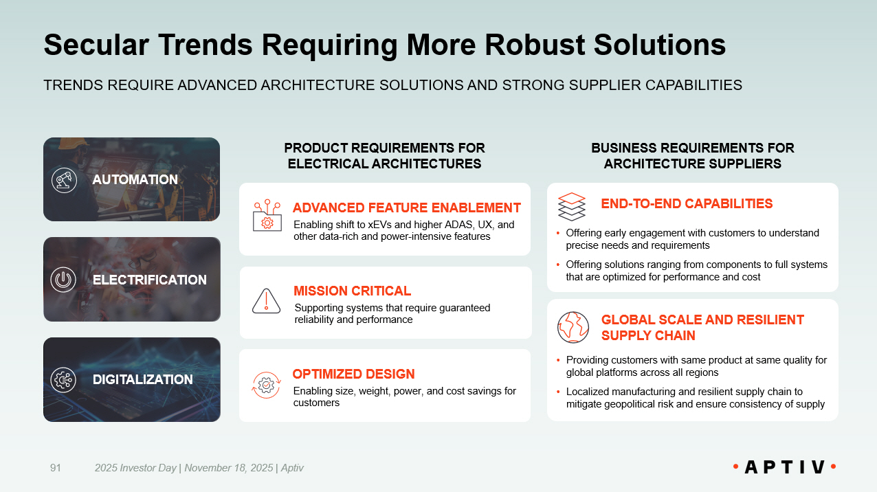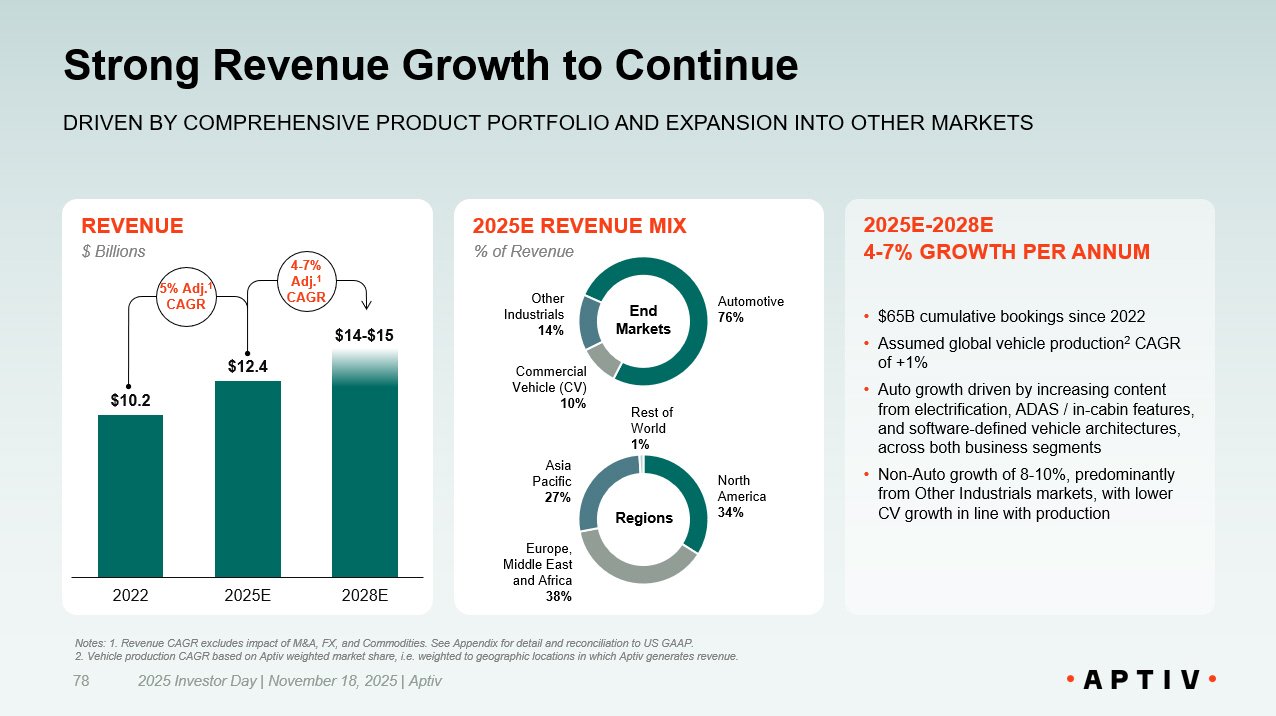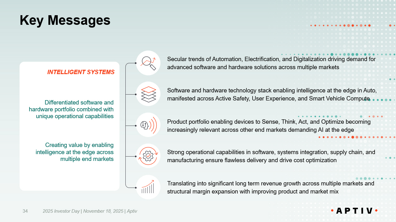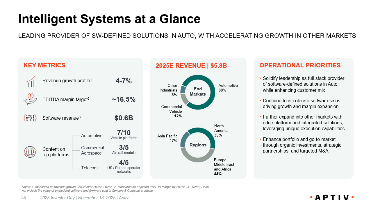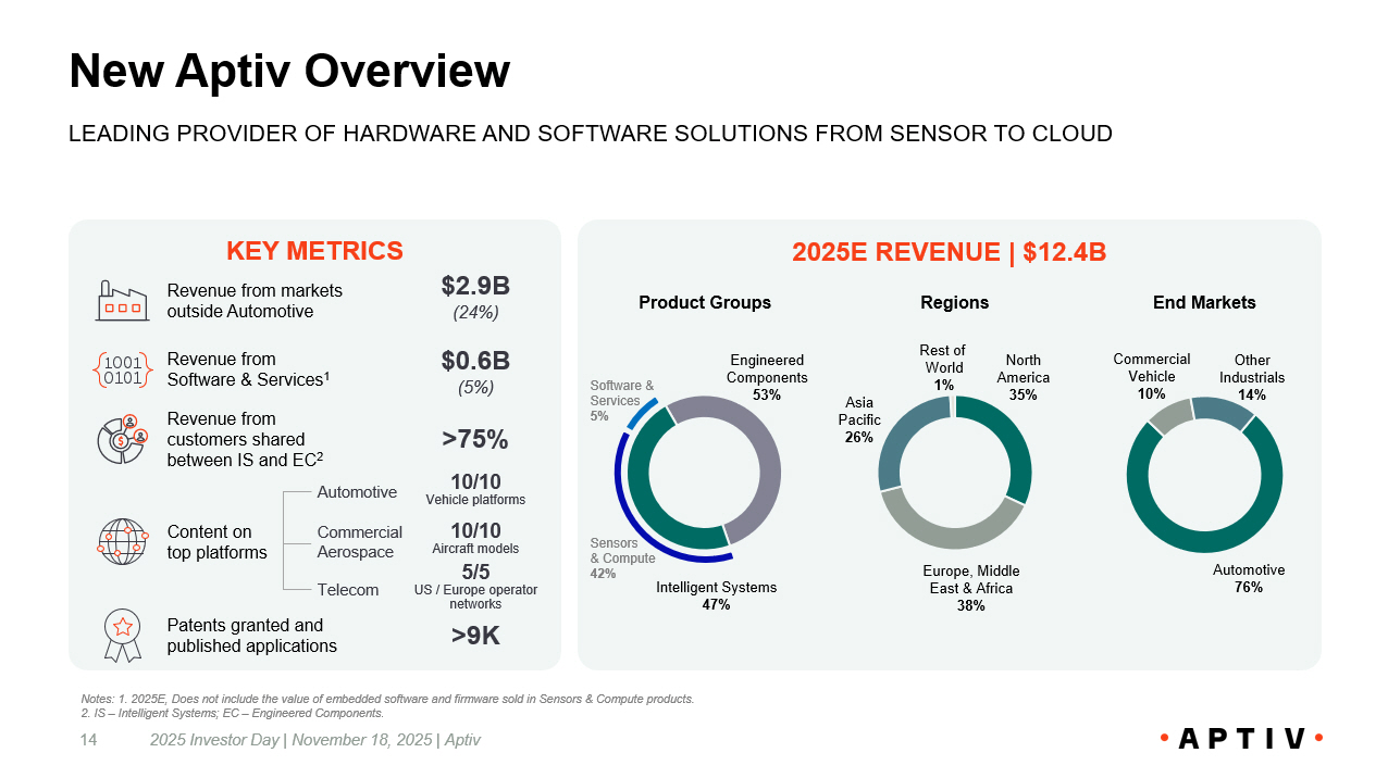 前瞻性陈述本演示文稿以及Aptiv PLC(“公司”)作出的其他陈述均包含前瞻性陈述,这些陈述在作出时反映了公司目前对当前事件、某些投资和收购以及财务业绩的看法。此类前瞻性ng报表受到与公司运营和商业环境有关的许多风险、不确定性和因素的影响,这可能导致公司的实际结果与任何未来结果存在重大差异。所有涉及未来经营、财务或业务表现或美国商务部战略或预期的声明均为前瞻性声明。可能导致实际结果与这些前瞻性陈述产生重大差异的因素包括但不限于以下方面:全球和区域经济状况,包括影响信贷市场的状况;全球通胀前南下区域资源;乌克兰和俄罗斯之间的冲突造成的不确定性,及其对欧洲和全球经济和我们在每个国家的业务的影响;中东冲突造成的不确定性及其对全球经济的影响;利率和外币汇率的波动;全球汽车销售和生产的cy cli cal性质;公司产品不可或缺的原材料及其零部件的供应可能中断和竞争环境的变化,包括持续的半导体供应短缺;公司维持与其运营相关的合同的能力;有利的自由贸易法律和法规的潜在变化,例如美国-墨西哥-加拿大协议;signifi cant增加贸易关税、进口配额和其他贸易限制或行动的影响,包括对这些行动的报复性反应;税法的变化;fut ure重大公共卫生危机;公司整合和实现近期交易预期收益的能力;公司从以下方面获得预期收益的能力,或为完成,建议将其配电系统业务分离;公司吸引、激励和/或留住关键高管的能力;公司在罢工期间避免或继续运营的能力,或其任何联合国核工业组织员工或其主要客户的员工部分停工或减速的能力;以及公司吸引和留住客户的能力。其他因素在公司提交给美国证券交易委员会的文件中的标题“风险因素”和“管理层对财务状况和运营结果的讨论和分析”下进行了讨论。新的风险和不确定性不时出现,我们无法预测这些事件或它们可能如何影响公司。要记住的是,普通股的价格和从中获得的任何收益,都可以下降,也可以上升。无论是由于新信息、未来事件和/或其他原因,除非法律可能要求,否则Aptiv不承担任何更新或修改任何前瞻性陈述的义务或义务。2025年投资者日| 2025年11月18日| Aptiv 2