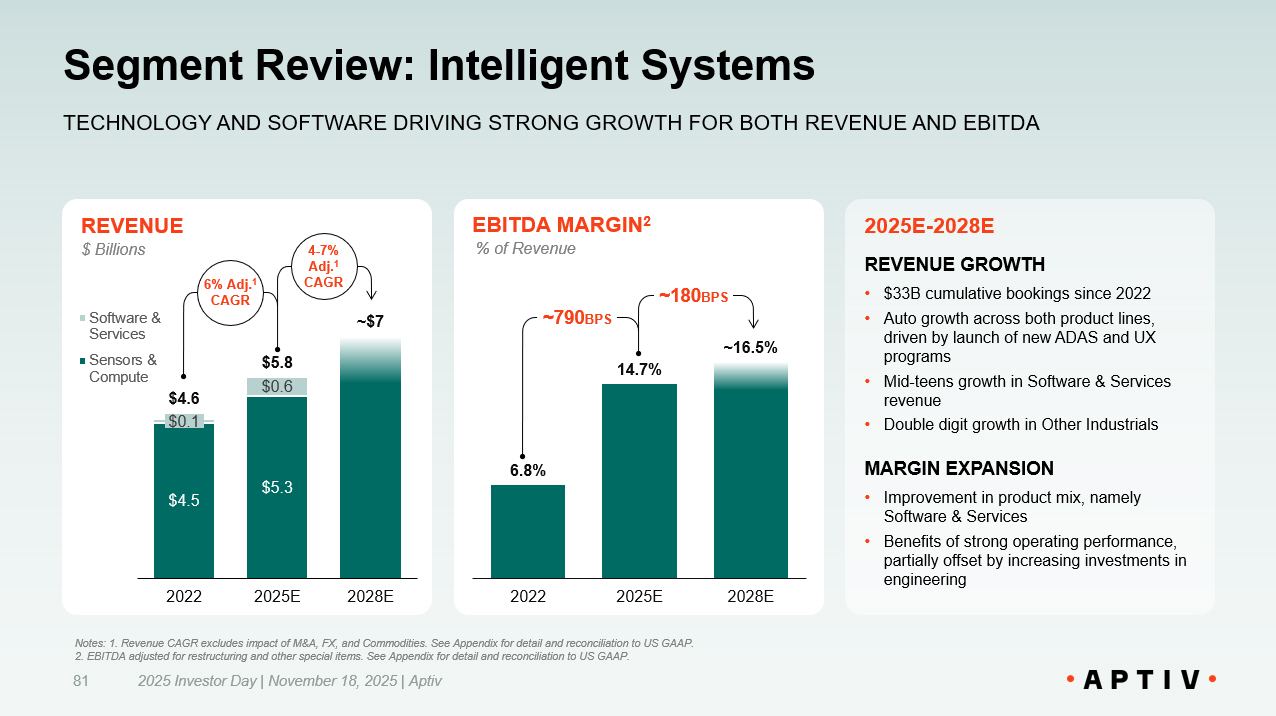智能系统摘要53个长期趋势推动了对智能、安全认证软件和强大、高效硬件的需求,使解决方案能够感知、思考、行动和优化Aptiv是汽车边缘扩展智能的领导者,跨主动安全、用户体验和智能车辆计算的领先产品组合就是证明,全面的软硬件技术堆栈准备在处于早期增长阶段的非汽车应用中实现类似能力,目标是到2028年实现4-7 %的收入增长1和~16.5%的EBITDA 2利润率,产品组合通过跨软件开发的强大运营能力得到增强,系统集成、供应链和制造强大的产品组合和运营能力,推动可持续、有利可图的增长2025年投资者日| 2025年11月18日| Aptiv备注:1。收入CAGR不包括并购、外汇和大宗商品的影响。有关详细信息以及与美国公认会计原则的对账,请参见附录。2.经重组和其他特殊项目调整的EBITDA。有关详细信息以及与美国公认会计原则的对账,请参见附录。