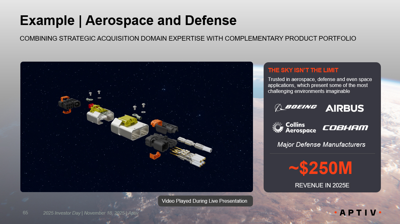 示例|航空航天和国防结合战略收购领域专业知识与补充产品组合在航空航天、国防甚至空间应用中,天空并不是值得信赖的极限,它们呈现出一些主要国防制造商可以想象到的最具挑战性的环境~2025年收入2.5亿美元652025投资者日| 2025年11月18日|在现场演示期间播放的Aptiv视频