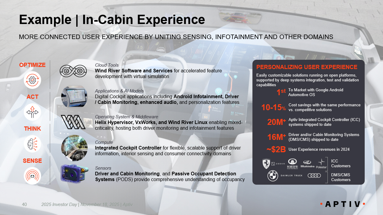 个性化用户体验在开放平台上运行的可轻松定制的解决方案,由深度系统集成、测试和验证能力支持40例|通过将传感、信息和其他领域结合起来,舱内体验与更多的用户体验相关联~2024年2B美元的用户体验收入中,Aptiv集成座舱控制器(ICC)系统迄今已出货20m +的驾驶员和/或座舱监控系统(DMS/CMS),与具有竞争力的解决方案相比,迄今已出货20m +的相同性能的驾驶员和/或座舱监控系统(DMS/CMS)节省了1600万+的成本,与采用谷歌Android Automotive OS 1应用程序和AI模型的数字座舱应用程序(包括Android Infotainment,驾驶员/驾驶室监控、增强音频和个性化功能云工具Wind River软件和服务用于加速特征开发,虚拟仿真计算集成驾驶舱控制器可灵活、可扩展地支持驾驶员信息、内部传感和消费者连接域传感器驾驶员和驾驶室监控,被动乘员检测系统(PODS)提供对占用操作系统和中间件Helix Hypervisor、VXWorks和Wind River Linux的全面理解,可实现混合临界,同时托管驾驶员监控和信息娱乐功能ICC客户DMS/CMS客户SENSE THINK OPPTIMIZE ACT 2025投资者日| 2025年11月18日| Aptiv