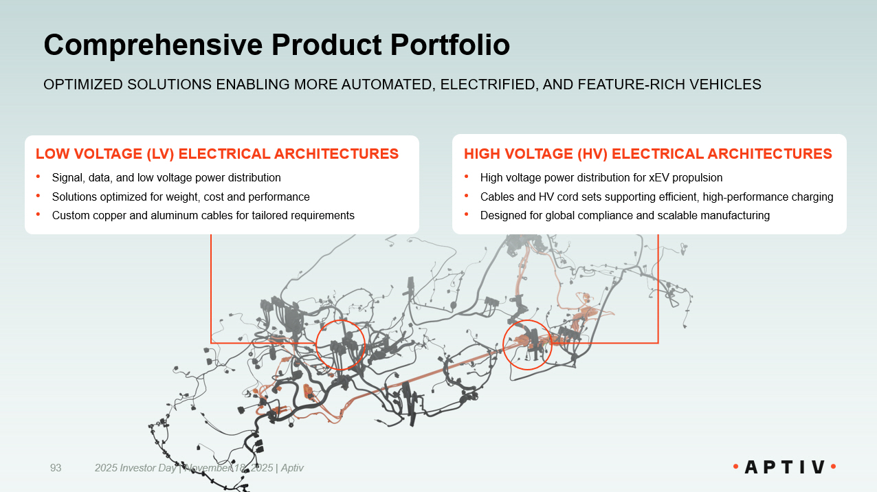 全面产品组合2025投资者日| 2025年11月18日| Aptiv 93种优化解决方案,可实现更自动化、电气化和FE ATURE RICH Vehicles HIGH VOLTAGE(HV)Electric Architects •用于xEV推进的高压电力分配•支持高效、高性能充电的电缆和HV线组•专为全球合规和可扩展的制造低压(LV)Electric Architects而设计•信号、数据和低压配电•针对重量、成本和性能优化的解决方案•针对定制需求定制铜和铝电缆