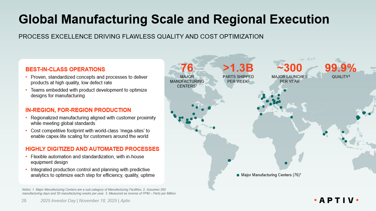全球制造规模与区域执行2025投资者日| 2025年11月18日| Aptiv 28道工序卓越驱动完美无瑕的质量和成本优化最佳一流运营•经过验证的标准化理念和流程,以高质量、低不良率交付产品•嵌入产品开发的团队,为区域内的制造优化设计,For-Region Production •区域化制造符合客户接近度,同时满足全球标准•具有成本竞争力的足迹与世界级的‘巨型站点’,为世界各地的客户实现资本支出-Lite扩展高度数字化和自动化的过程•灵活的自动化和标准化,采用内部设备设计•集成生产控制和规划,以预测分析优化每个步骤的效率、质量、正常运行时间~每年300次主要发射>每周发货1.3B件276主要制造中心199.9%质量3注:1。主要制造中心是制造设施的一个子类。2.假设每年260个制造日和50个制造周。3.测量为PPM的倒数–百万分之。主要制造中心(76)1