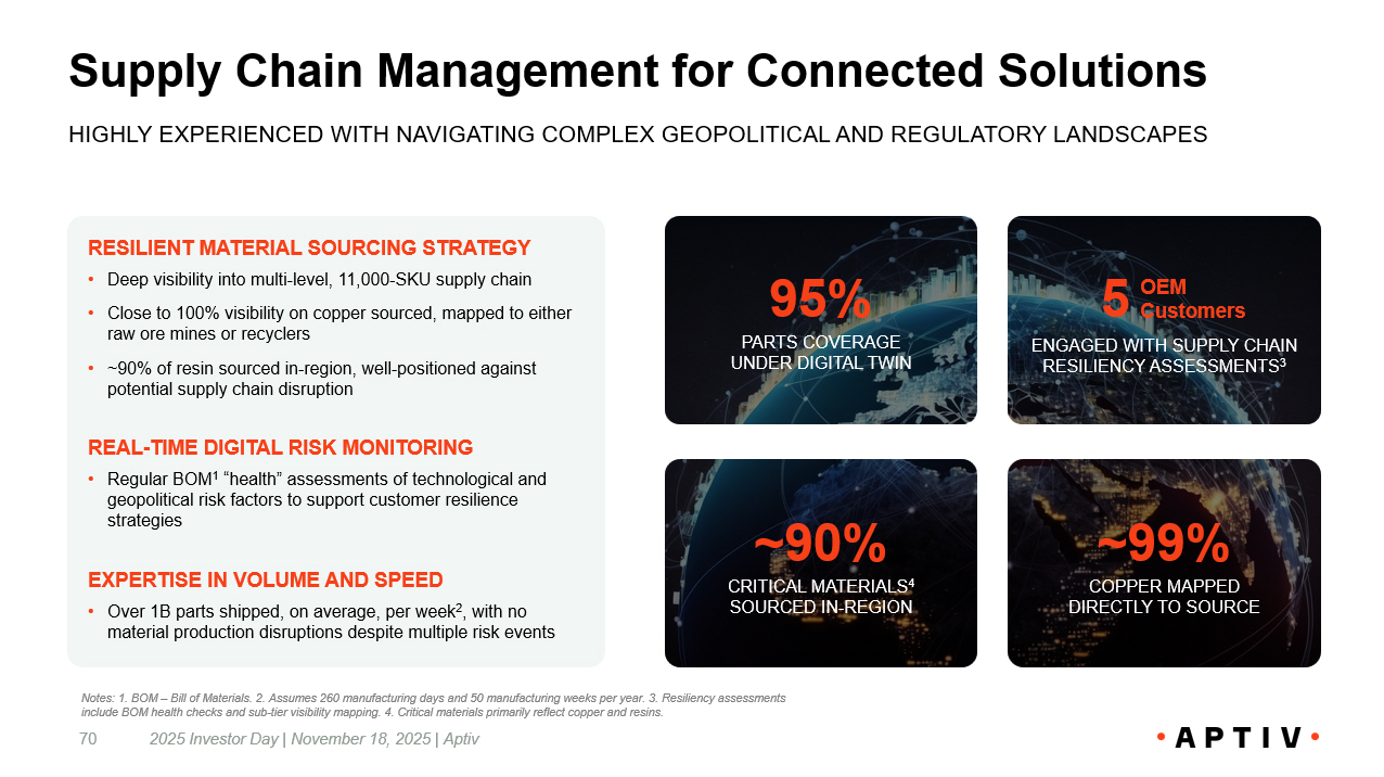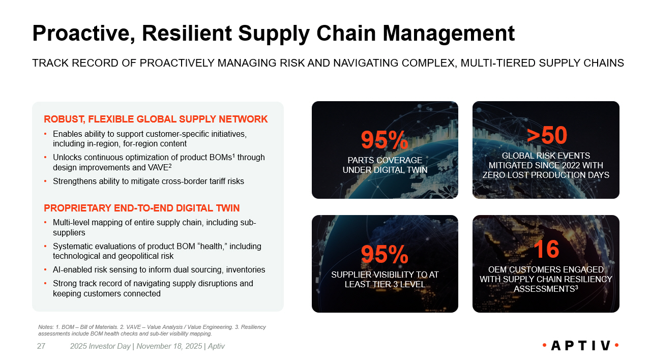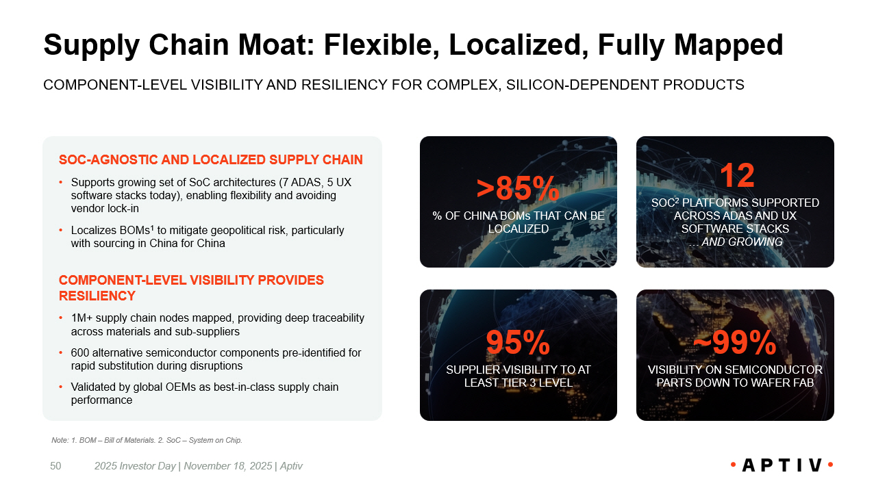 供应链护城河:灵活、本地化、完全映射的2025年投资者日| 2025年11月18日| Aptiv 50组件-Complex、Silicon-Dependent Products 12 SOC 2 Platforms跨ADAS和UX软件堆栈支持的级别可见性和复原力……并将95%的供应商可见性增长到至少Tier 3 level~SECONDC零件上的99%可见性down to WAFER FAB > 85%%可以本地化SOC的中国BOM-AGNOST启用灵活性并避免供应商锁定•将BOMs 1本地化以减轻地缘政治风险,特别是在中国采购中国组件-级别可见度提供了复原力•绘制了100万+个供应链节点,提供了跨材料和次级供应商的深度可追溯性• 600个可供替代的半导体组件预先确定,以便在中断期间快速替代•被全球原始设备制造商验证为一流的供应链性能注:1。BOM –物料清单。2.SoC –片上系统。