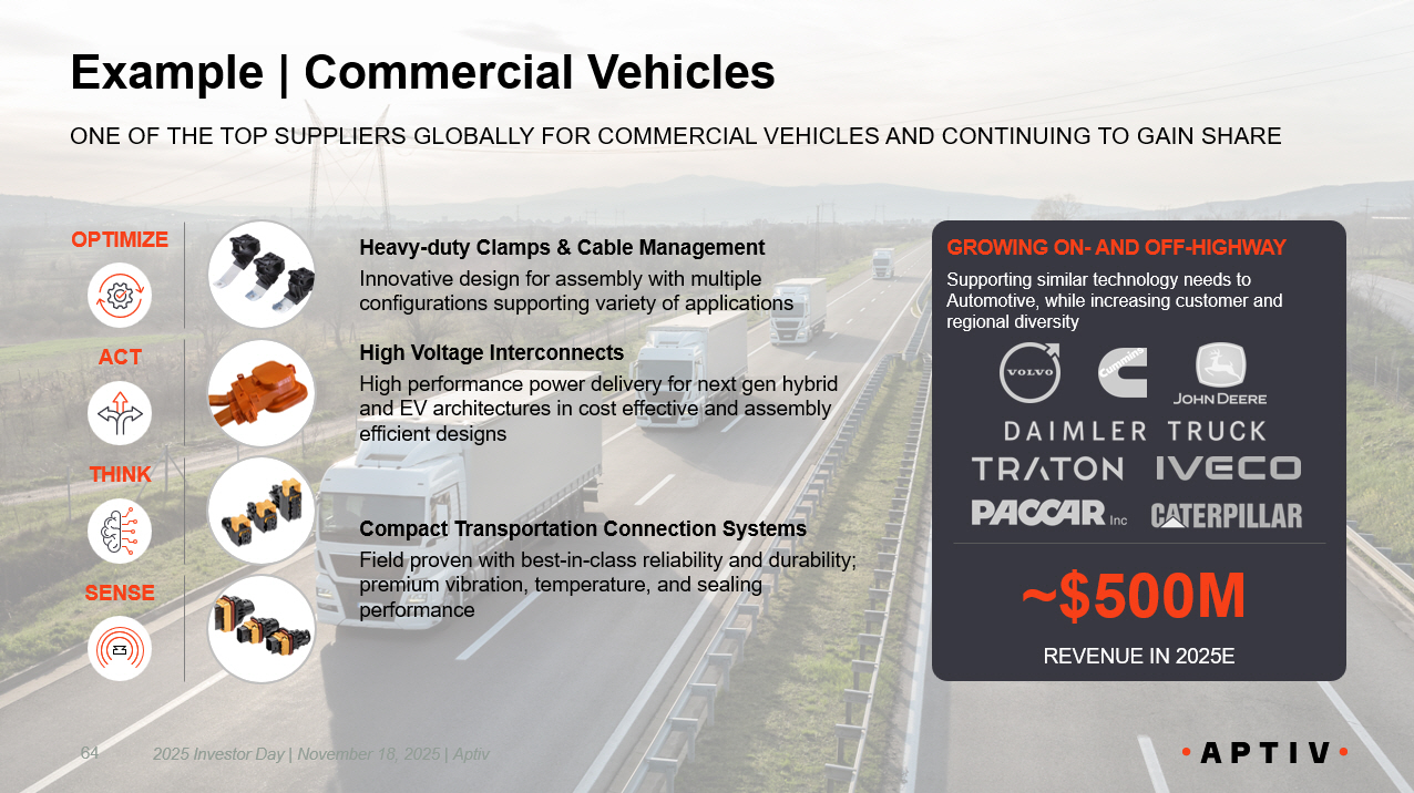 示例|商用车是全球商用车的顶级供应商之一,并继续获得共享感,认为Optimize ACT高压互连为下一代混合动力和EV架构提供具有成本效益和装配效率的高性能电力交付设计重型夹具和电缆管理用于装配的创新设计,具有支持各种应用的多种配置的紧凑型交通连接系统领域,经证明具有一流的可靠性和耐用性;优质的振动、温度和密封性能在上上下下不断增长-支持类似技术需求的高速公路,同时增加客户和区域多样性~2025年收入5亿美元642025年投资者日| 2025年11月18日| Aptiv