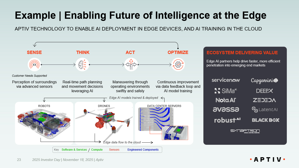 数据中心服务器示例| Enabling Future of Intelligence at the Edge 2025 Investor Day | 2025年11月18日| Aptiv 23 APTIV TECHNOLOGY启用AI在边缘设备中的部署,云感思维行为中的AI培训通过先进的传感器优化对周围环境的感知实时路径规划和运动决策,利用AI在操作环境中快速安全地操纵,通过数据反馈循环和AI模型训练持续改进客户需求支持的无人机机器人生态系统实现价值边缘AI合作伙伴帮助驾驶更快,更有效地渗透到新兴终端市场边缘AI模型经过训练和部署的边缘数据流到云端软件和服务计算传感器工程组件关键