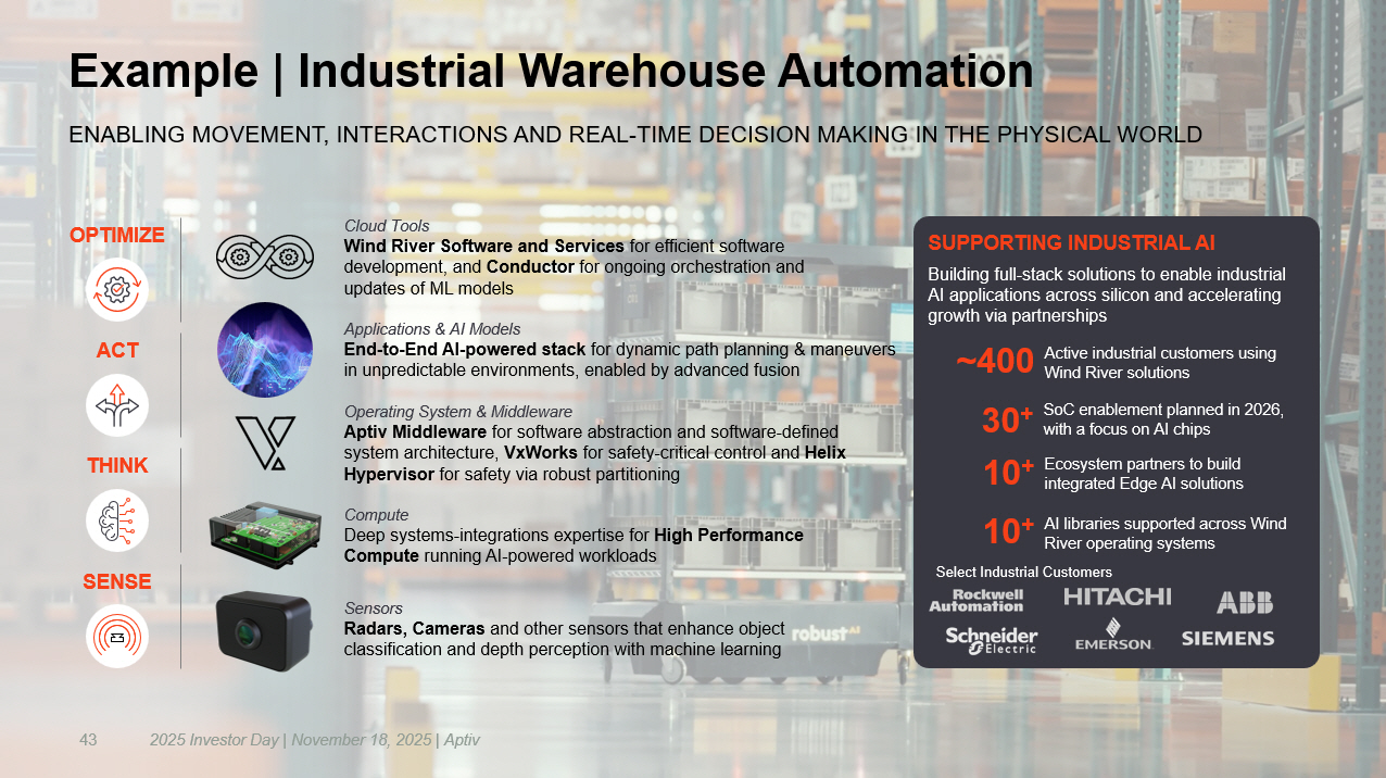 43例|工业仓库自动化使能物理世界中的移动、交互和实时决策支持工业AI构建全栈解决方案,以支持跨硅的工业AI应用,并通过合作伙伴关系实现增长应用程序和AI模型端到端AI驱动的堆栈,用于在不可预测的环境中进行动态路径规划和机动,由先进的融合云工具支持Wind River软件和服务,以实现高效的软件开发,和用于ML模型的持续编排和更新的导体Compute Deep System-用于运行AI驱动的工作负载的高性能计算的集成专业知识,这些传感器通过机器学习操作系统和用于软件抽象和软件定义系统架构的中间件Aptiv中间件增强对象分类和深度感知的雷达、摄像头和其他传感器,用于安全关键控制的VXWorks和用于安全的Helix Hypervisor,通过使用Wind River解决方案的强大分区活跃工业客户~计划于2026年启用400 SoC,以AI芯片为重点30 + 10 +生态系统合作伙伴构建一体化边缘AI解决方案10 + AI库支持跨Wind River操作系统SENSE THINK Optimize ACT 2025投资者日| 2025年11月18日| Aptiv精选产业客户