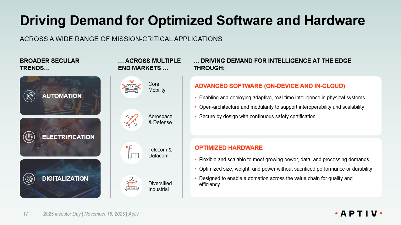 长期趋势改变多个终端市场16 + = SAFE THEN:安全ADAS特性Now:L2 + +便利特性•面向多个用例的高度自动化机器人和无人机自动技术以最少的人工干预执行复杂任务GREEN THEN:通过BEV实现零排放Now:BEV、PHEV和HEV实现电气化•电气化设备数量增加•以人工智能为重点的数据中心激增的电力需求为边缘的供电设备提供动力,然后使基础设施能够连接起来:5G连接和数据Now:软件定义特性,与OTA无缝更新•软件定义的消费者和企业生态系统•部署在边缘的AI(“边缘AI”)和不断更新的数字化利用互联技术提供洞察力、转变运营、释放价值塑造的客户需求,跨越应用程序和市场,其他行业出现的需求更广泛的、核心移动需求演变的Secular Trends 2025 Investor Day | 2025年11月18日| Aptiv
