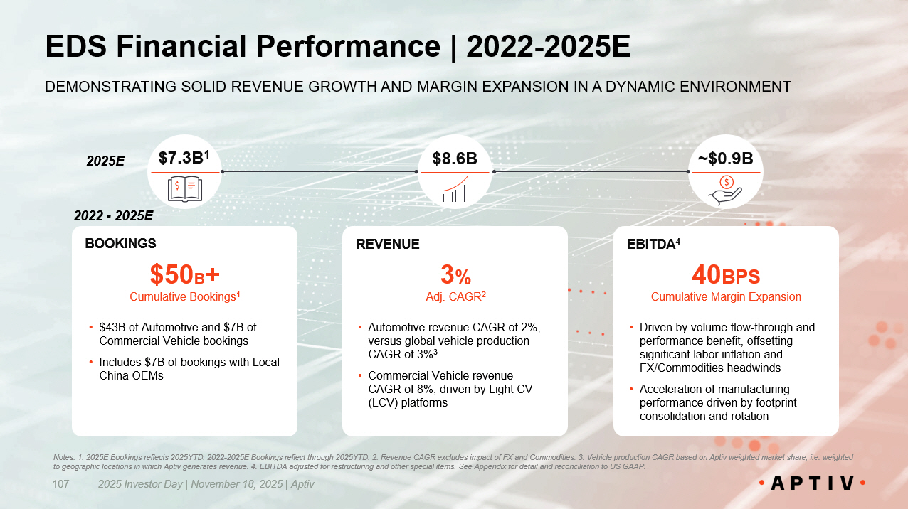 ~$ 0.9B EDS财务业绩| 2022-2025E 2025年投资者日| 2025年11月18日| Aptiv 107在动态环境中展示稳健的收入增长和利润率扩张注:1。2025E预订量反映了2025YTD。2022-2025年预订量反映到2025年年初至今。2.收入CAGR不包括外汇和D商品的影响。3.整车产量CAGR基于Aptiv加权市场份额,即加权到Aptiv产生收入的地理位置。4.经重组和其他特殊项目调整后的EBITDA。有关详细信息以及与美国公认会计原则的对账,请参阅ppe ndix。收入•汽车收入复合年增长率为2%,而全球汽车产量复合年增长率为3% 3 •商用车收入复合年增长率为8%,由轻型CV(LCV)平台推动3%调整后。复合年增长率2 EBITDA 4 •由销量流量和业绩效益驱动,抵消显着的劳动力通胀和外汇/大宗商品逆风•由足迹整合和轮换推动的制造业业绩加速40BP累计利润率扩张2025e2022-2025E $ 8.6b预订• $ 43B的汽车和$ 7B的商用车预订•包括$ 7B的中国本土原始设备制造商预订额$ 50b +累计预订额1 $ 7.3B 1