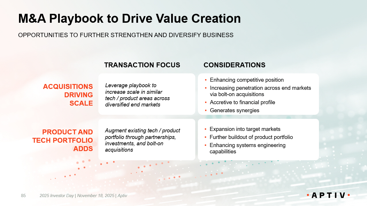 推动价值创造的并购剧本85个机会进一步加强推动规模的业务收购并使其多样化•提高竞争地位•通过螺栓收购提高在终端市场的渗透率•对财务状况有增值作用•产生协同效应交易重点考虑•向目标市场扩张•进一步扩大产品组合•增强系统工程能力产品和技术组合增加杠杆剧本,以在多元化终端市场的类似技术/产品领域增加规模通过合作伙伴关系、投资和螺栓收购,增强现有技术/产品组合2025年投资者日| 11月18日,2025 | Aptiv