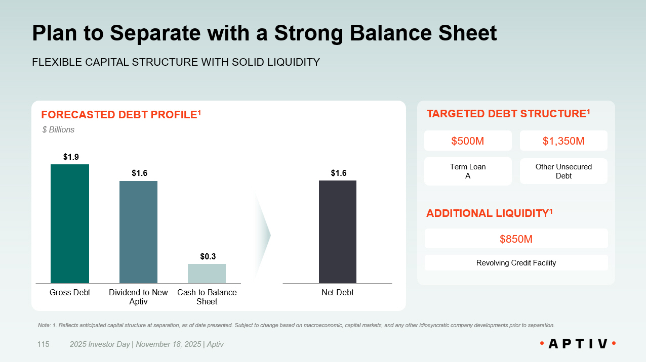计划以强劲的资产负债表分离2025年投资者日| 2025年11月18日| Aptiv 115具有坚实流动性的灵活资本结构预测债务概况1目标债务结构1额外流动性1美元1.9美元1.6美元0.3美元毛债务股息新的Aptiv现金与资产负债表1.6美元净债务十亿美元注:1。反映离职时的预期资本结构,截至呈报日期。受制于基于宏观经济、c资本市场以及任何其他在分离前的特殊公司发展的变化。定期贷款A其他无担保债务5亿美元13.5亿美元循环信贷融资8.5亿美元