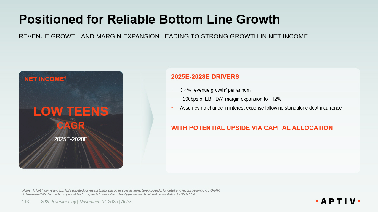 2025年投资者日| 2025年11月18日| Aptiv 113定位于可靠的底线增长收入增长和利润率扩张导致净收入强劲增长净收入1低十岁的复合年增长率2025e-2028e注:1。经重组和其他特殊项目调整后的净收入和EBITDA。有关详细信息和美国公认会计原则的对账,请参见附录。2.收入CAGR不包括并购、外汇和大宗商品的影响。有关详细信息以及与美国公认会计原则的对账,请参见附录。2025e-2028E驱动因素• 3-4%的收入增长2每年•~200bps的EBITDA 1利润率扩大至~12% •假设独立债务发生后利息支出没有变化,可能通过资本分配出现上行