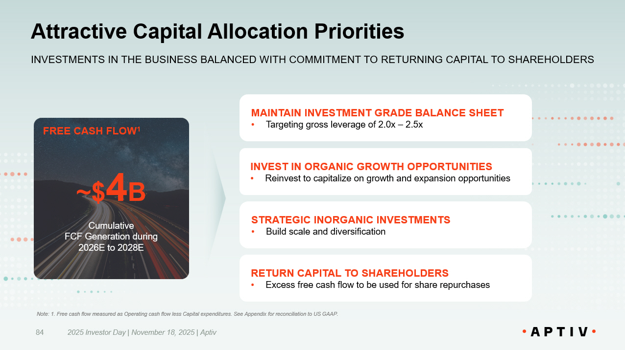 新的APTIV每股收益1在强劲收益的推动下实现中等青少年每股收益增长,其中资本分配83~8.00美元~7.70美元~2.20美元~5.50美元2025e备考调整2025e新的Aptiv丨PF EPS 2028e新的AptivEPS mid-Teens % CAGR十亿美元2025e-2028e驱动因素•每年收入增长4-7% • EBITDA利润率扩大至~200bps •假设分离后资本重组后利息支出没有变化•有效税率略有提高•假设股份数量不变……通过CCI可能出现上行投资者日| 2025年11月18日| Aptiv备注:1。经重组及其他特殊项目调整后的EPS。有关详细信息以及与美国公认会计原则的对账,请参见附录。2.2025 E反映了以2025年第三季度收益确定的指导中点计算的总Aptiv每股收益。3.备考调整并未反映独立的EDS EPS,而是反映分离到新的Aptiv的净影响,包括税收和利息费用的变化。