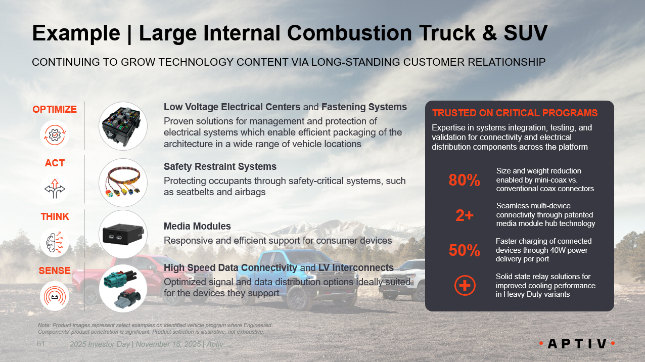 示例|大型内燃车& SUV 61信赖关键方案跨平台连接和配电组件的系统集成、测试和验证方面的专业知识低压电气中心和紧固系统经过验证的电气系统管理和保护解决方案,可在广泛的车辆位置实现架构的高效封装高速数据连接和LV互连优化的信号和数据分配选项,非常适合它们支持的设备安全约束系统,通过安全关键系统保护乘员,如安全带和安全气囊媒体模块通过专利媒体模块集线器技术为消费设备提供响应式和高效的支持无缝的多设备连接2 + 50%更快地通过每个端口40W电力传输为连接的设备充电mini-coax与传统同轴连接器相比实现80%尺寸和重量减轻的固态继电器解决方案,用于改善重型变体中的冷却性能SENSE THINK OPTIMIZE ACT注:产品图像代表已确定的车辆程序中的选定示例,其中工程组件的产品渗透率很大。产品选择是说明性的,不是详尽无遗的。2025投资者日| 2025年11月18日| Aptiv通过长期的客户关系持续增长技术内容+