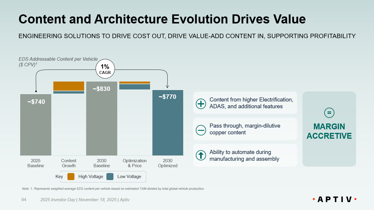 2025年基线内容增长2030年基线优化&价格2030年优化的内容和架构演变推动价值2025投资者日| 2025年11月18日| Aptiv 94种工程解决方案,用于驱动成本、驱动价值-在其中添加内容,支持来自更高电气化、ADAS和附加功能的盈利能力内容,保证金-稀释性铜含量~740美元~7701% CAGR =在制造和组装过程中实现自动化的Ability每辆车高压低压关键EDS可寻址内容($ CPV)1注:1。表示基于估计TAM除以全球汽车总产量n.~830美元的每辆汽车加权平均EDS含量