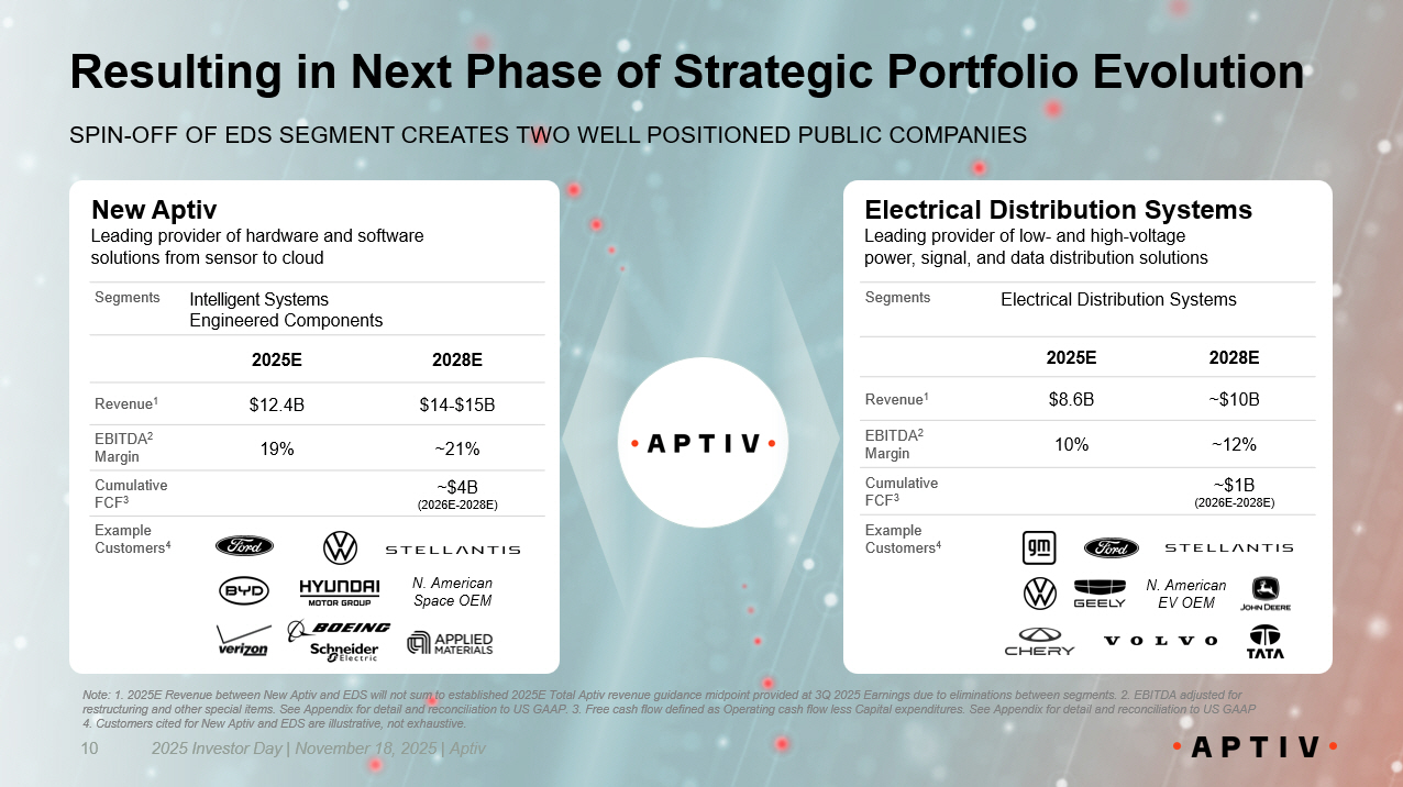 导致下一阶段策略组合演变2025投资者日| 11月18日,2025 | EDS部门的Aptiv 10z分拆关闭创造两个良好状态的公共公司智能系统工程组件部门2028E 2025E $ 14-$ 15B $ 12.4B收入1~21% 19% EBITDA 2 margin~$ 4B(2026E-2028E)累计FCF 3个示例客户4个新的从传感器到云电气分配系统部门的硬件和软件解决方案领先供应商2028E 2025E~$ 10B $ 8.6B收入1~12% 10% EBITDA 2 margin~$ 1B(2026E-2028E)累计TERM0 3个示例客户4个电气分配系统低-和和数据分发解决方案N. American Space OEM N. American EV OEM注:1。由于分部之间的冲销,新的Aptiv和EDS之间的2025年收入将不等于2025年第三季度既定的2025年总Aptiv收入指导中点prov ide d的收益之和。2.经重组和其他特殊项目调整的EBITDA。有关详细信息以及与美国公认会计原则的对账,请参见附录。3.自由现金流定义为OP时代Ting现金流减去资本支出。有关详细信息以及与美国公认会计原则4的对账,请参见附录。为新的Aptiv和EDS引用的客户只是说明性的,而不是详尽无遗的。
