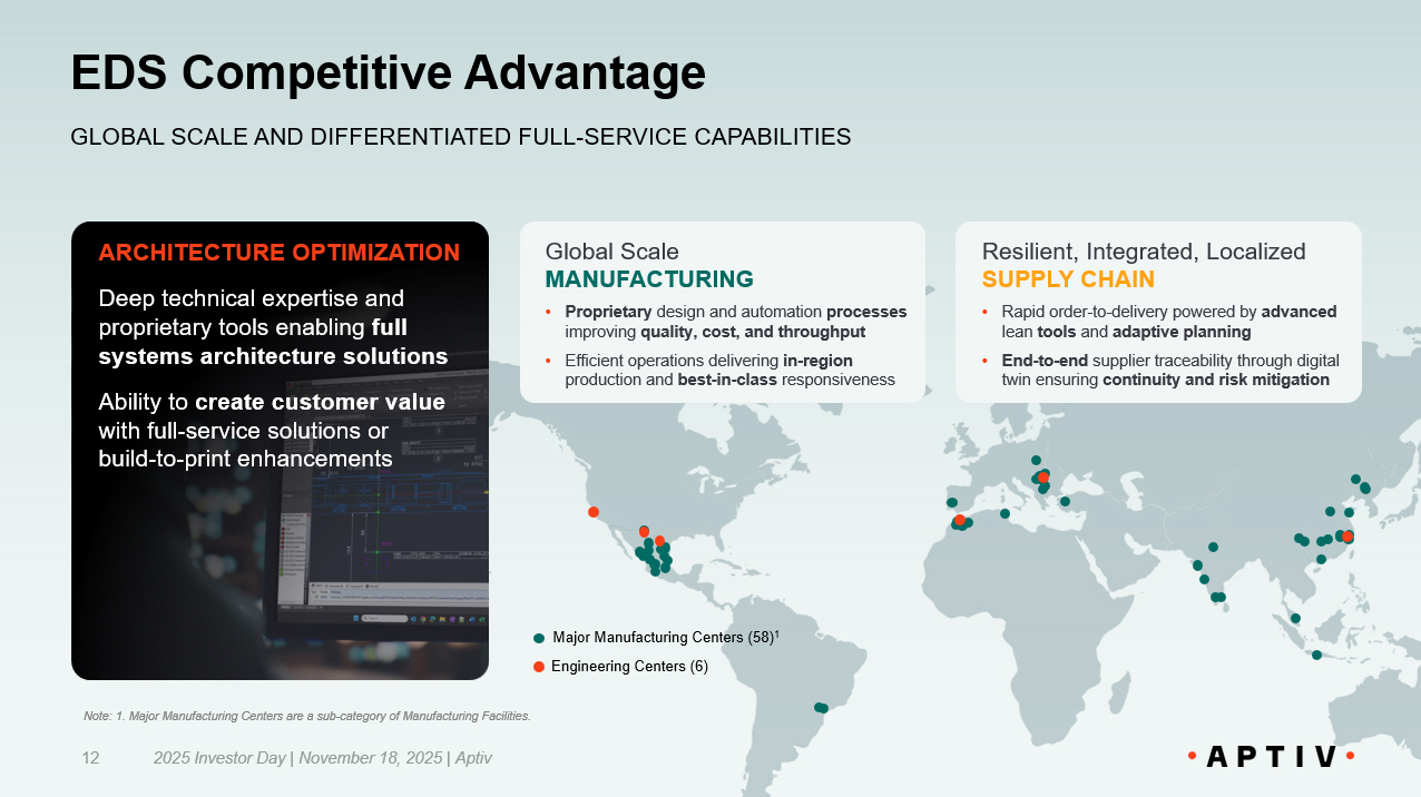 EDS竞争优势2025投资者日| 2025年11月18日| Aptiv 12项全球规模和差异化的全服务能力主要制造中心(58个)1个工程中心(6个)架构优化深厚的技术专长和专有工具,使全系统架构解决方案能够凭借全服务解决方案或自建到打印的增强功能创造客户价值全球规模制造•专有设计和自动化流程可提高质量、成本和吞吐量•高效运营交付区域内生产和一流的响应能力具有弹性、集成、本地化供应链•由先进的精益工具和自适应规划提供支持的快速订单到交付•通过数字孪生实现端到端供应商追溯,确保连续性和风险缓解注:1。主要制造中心是制造设施的一个子类。