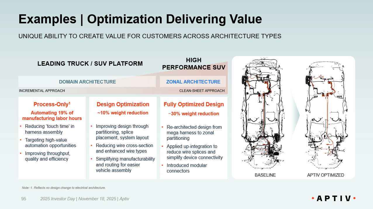 实例|优化传递价值独特的能力为客户创造跨架构类型流程的价值-仅需1个自动化19%的制造工时•减少线束组装中的“触摸时间”•瞄准高价值自动化机会•提高吞吐量、质量和效率设计优化~10%的重量减轻•通过分区、拼接放置来改进设计,系统布局•减少导线横截面和增强导线类型•简化可制造性和路线,更容易车辆组装全面优化设计~减重30% •重新架构设计from mega线束到区域分区•应用起来-集成以减少导线接头并简化设备连接•引入模块化连接器领先卡车/SUV平台高性能SUV领域架构区域架构清洁-表方法增量方法基线APTIV优化2025投资者日| 2025年11月18日| Aptiv 95注:1。反映没有设计更改电气架构。