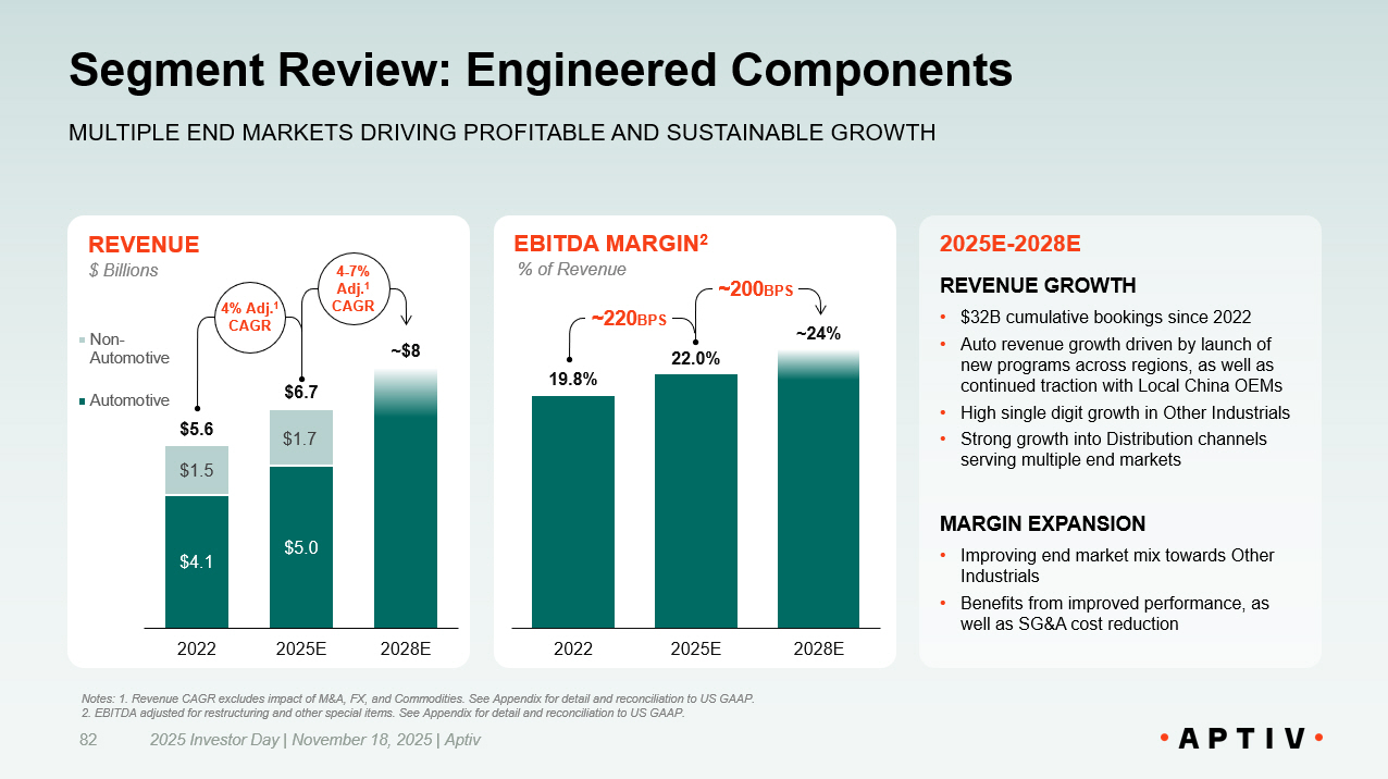 EBITDA利润率26.8% 14.7%~16.5% 20222025E 2028E收入$ 4.5 $ 5.3 $ 0.1 $ 0.6 $ 4.6 $ 5.8~$ 7 20222025E 2028E软件与服务传感器与计算部门回顾:智能系统2025投资者日| 2025年11月18日| Aptiv 81技术和软件驱动收入和EBITDA均实现强劲增长2025E-2028E收入增长•自2022年以来的累计预订量为$ 33B •两个产品线的汽车增长,受推出新的ADAS和UX计划的推动•软件和服务收入增长十几岁•其他行业实现两位数增长利润率扩大•产品组合改善,即软件和服务•强劲经营业绩带来的好处,部分被增加的工程投资所抵消数十亿美元收入的6% Adj. 1 CAGR 4-7% Adj. 1 CAGR~790 BPS~180 BPS注:1。收入CAGR不包括并购、外汇和大宗商品的影响。有关详细信息以及与美国公认会计原则的对账,请参见附录。2.经重组和其他特殊项目调整后的EBITDA。有关详细信息以及与美国公认会计原则的对账,请参见附录。